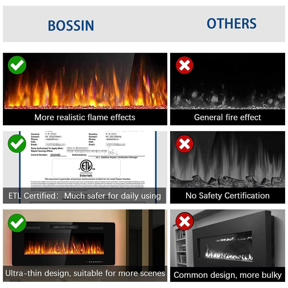 Fina na espessura A lareira elétrica Bossin apresenta um design fino, prático e leve. Com 7 centimetros de espessura, moldura linear preta, vidro temperado com saída de ar frontal, é uma elegante lareira contemporânea perfeitamente adequada para sua sala de estar, centro de entretenimento e quarto.