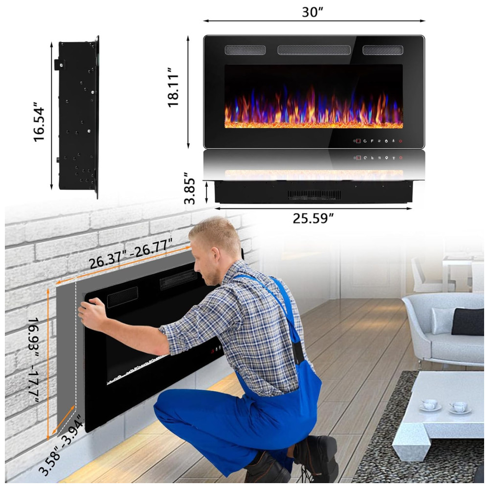 Lareira Elétrica de Embutir A46x76L com Controle Remoto Temporizador e Chamas Ajustavel 110V 1500W BOSSIN Preta