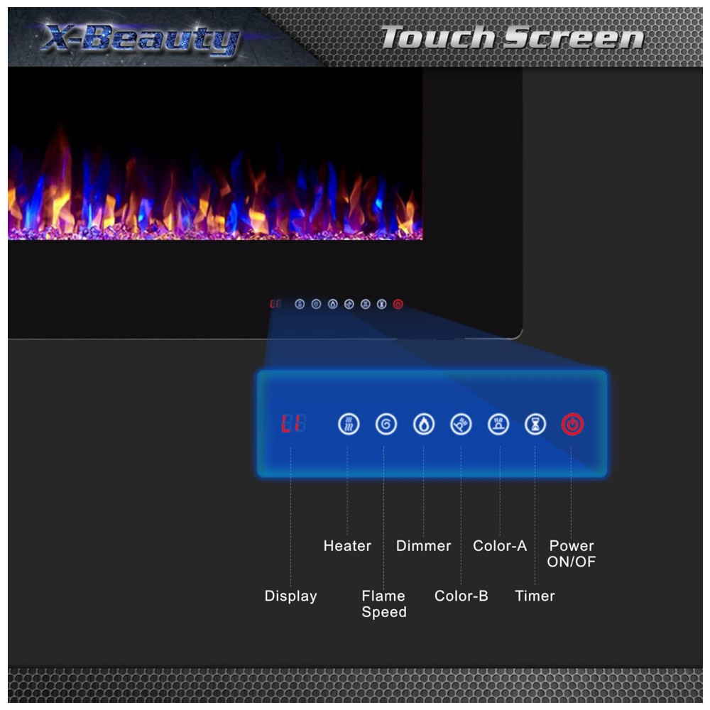 Modos de Controle Flexíveis: Controle remoto e tela sensível ao toque tornam mais conveniente controlar todas as funções da lareira elétrica: interruptor de energia, controle de temporizador de 1 a 8 horas, interruptor independente de aquecimento e chama, cor e velocidade da chama ajustáveis, função de modo de sono.