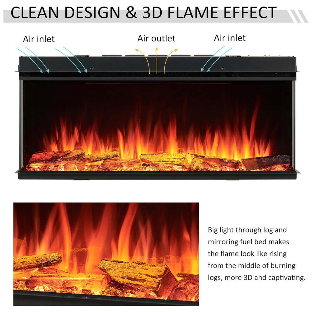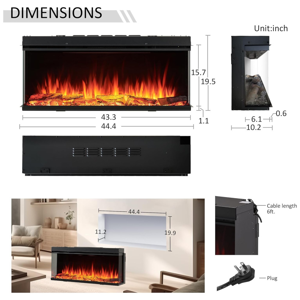 Construção e Design: Este aquecedor de lareira elétrica possui dimensões totais de 112,8 cm (L) x 49,5 cm (A) x 25,9 cm (P), e dimensões visíveis de 110 cm (L) x 39,9 cm (A) x 14 cm (P). Ele pode ser instalado em uma configuração de três lados, canto ou lateral única, com acabamento contínuo até a borda para um visual nivelado e elegante.