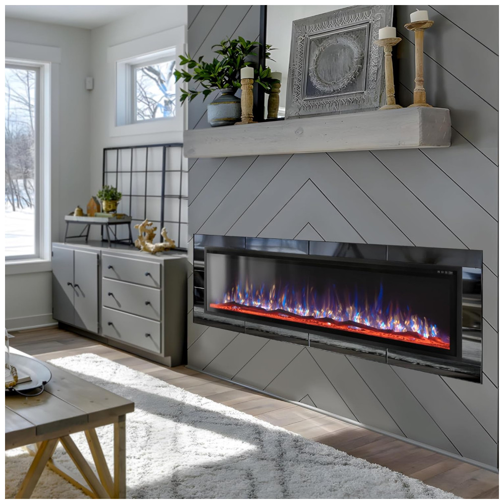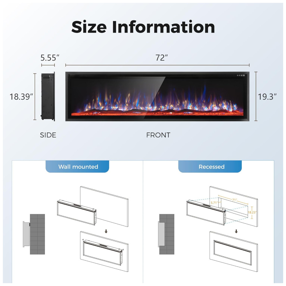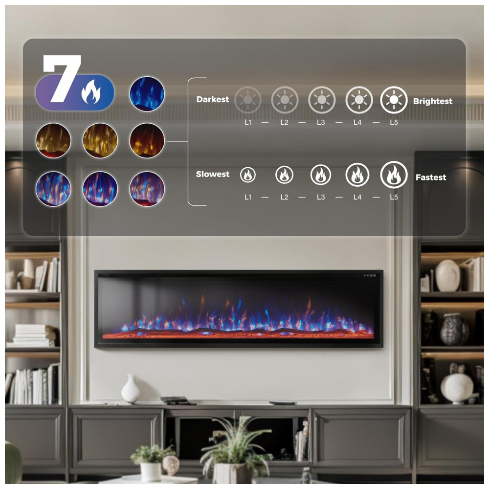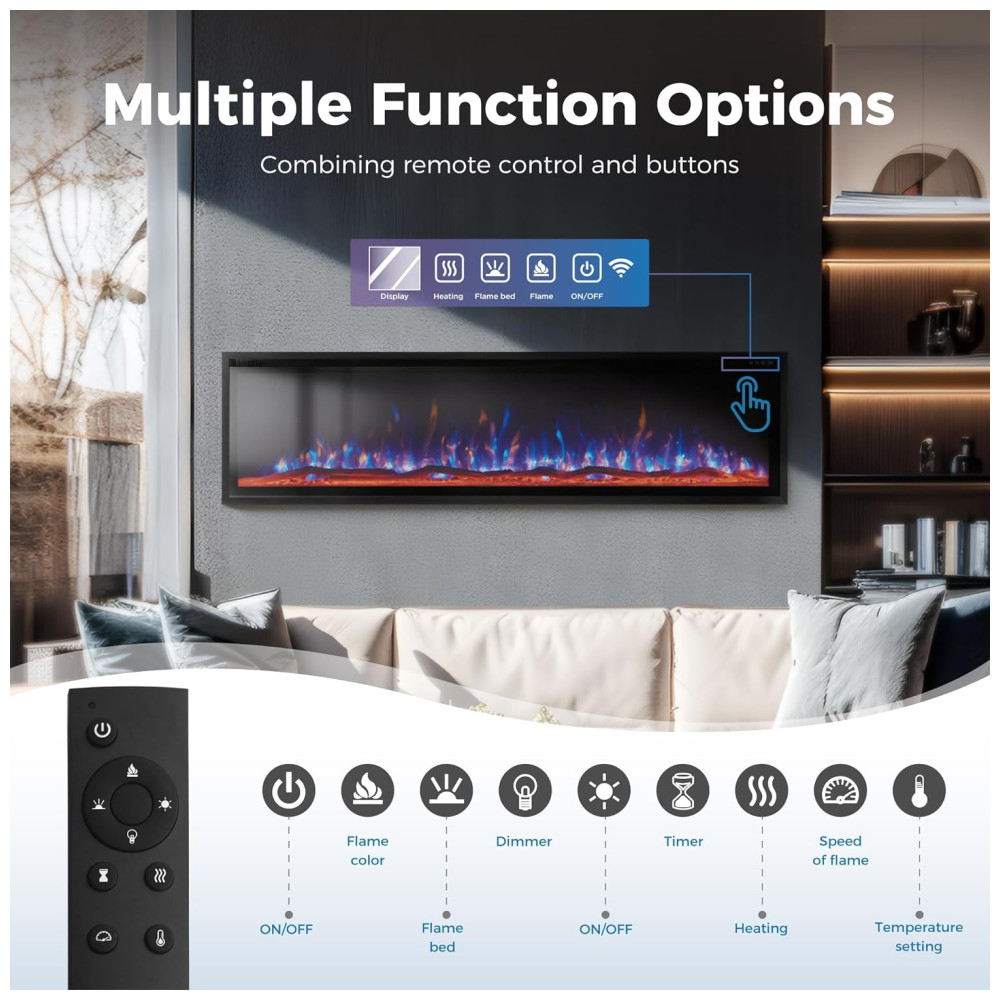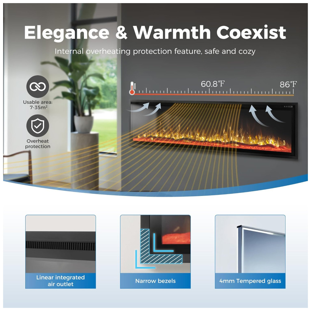 Eficiência no aquecimento: Com um sistema de aquecimento frontal de 750 W a 1500 W, a lareira pode aquecer eficazmente ambientes de até 37 m² (400 pés quadrados). Seu design linear com aberturas finas de entrada e saída de ar garante uma distribuição de calor eficiente e circulação de ar otimizada.