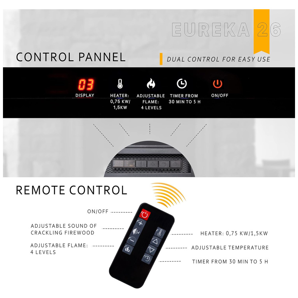 AJUSTE A SEU GOSTO A nossa lareira elétrica vem com um controle remoto para ajustar suas configurações. Use o para escolher entre diferentes modos de aquecimento, volume de som e níveis de brilho.