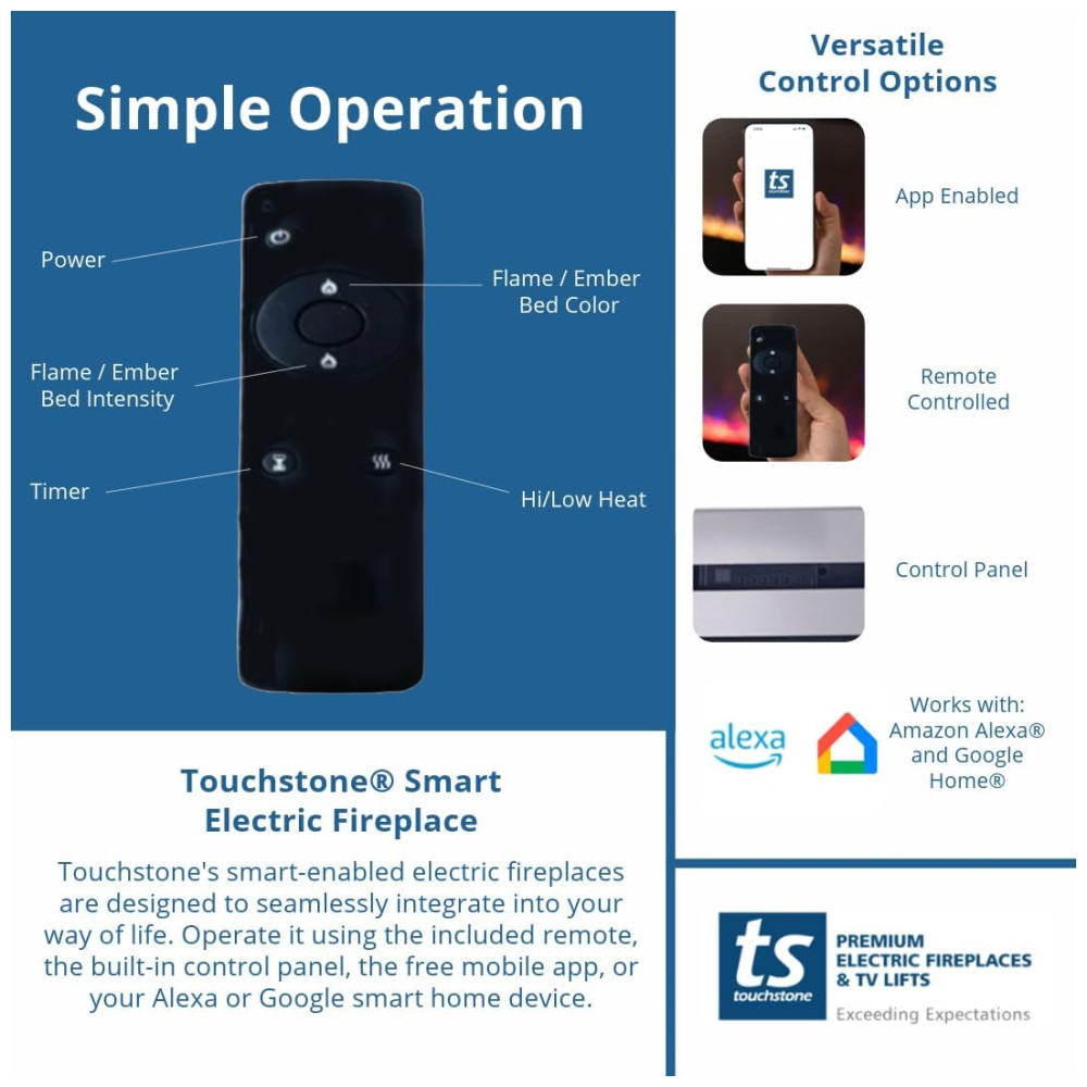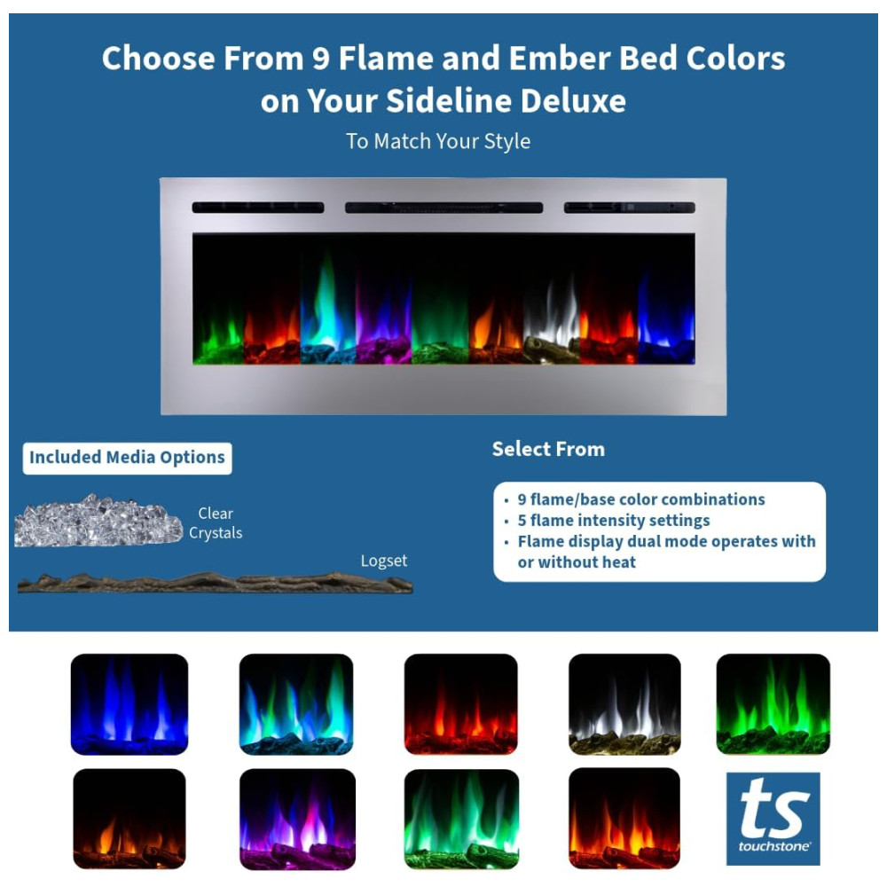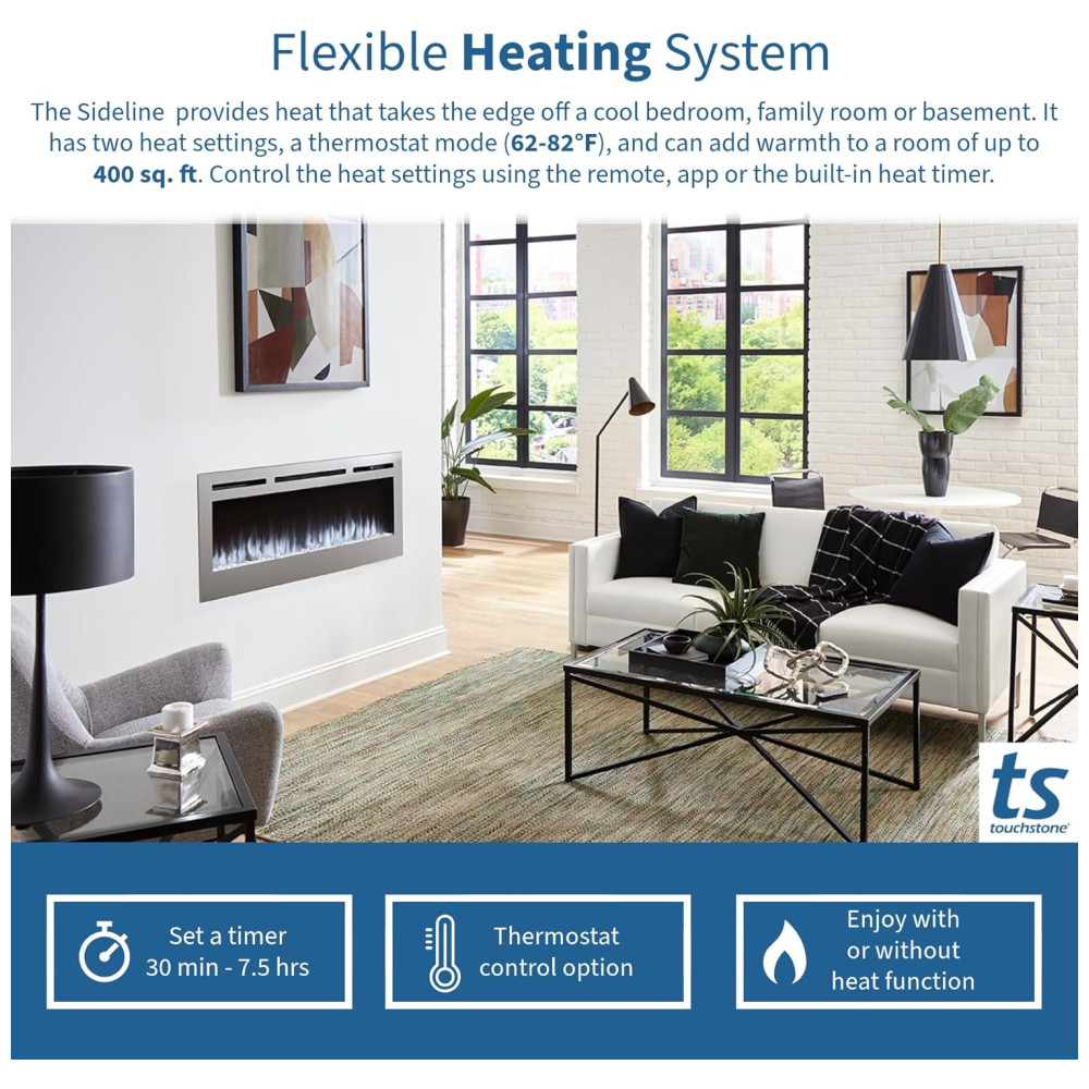 A Sideline possui uma chama incomparável. Inclui troncos falsos e cristais para criar uma sensação autêntica, além de um controle remoto IR que controla a cor e a intensidade da chama, o aquecedor e o temporizador de desligamento. As aberturas de aquecimento frontais permitem posicionar a Sideline apenas 20 cm abaixo de uma TV de tela plana. A Sideline pode ser conectada diretamente ou plugada na fonte de energia elétrica.