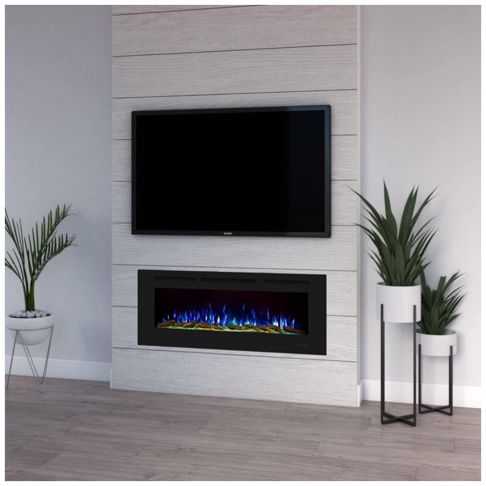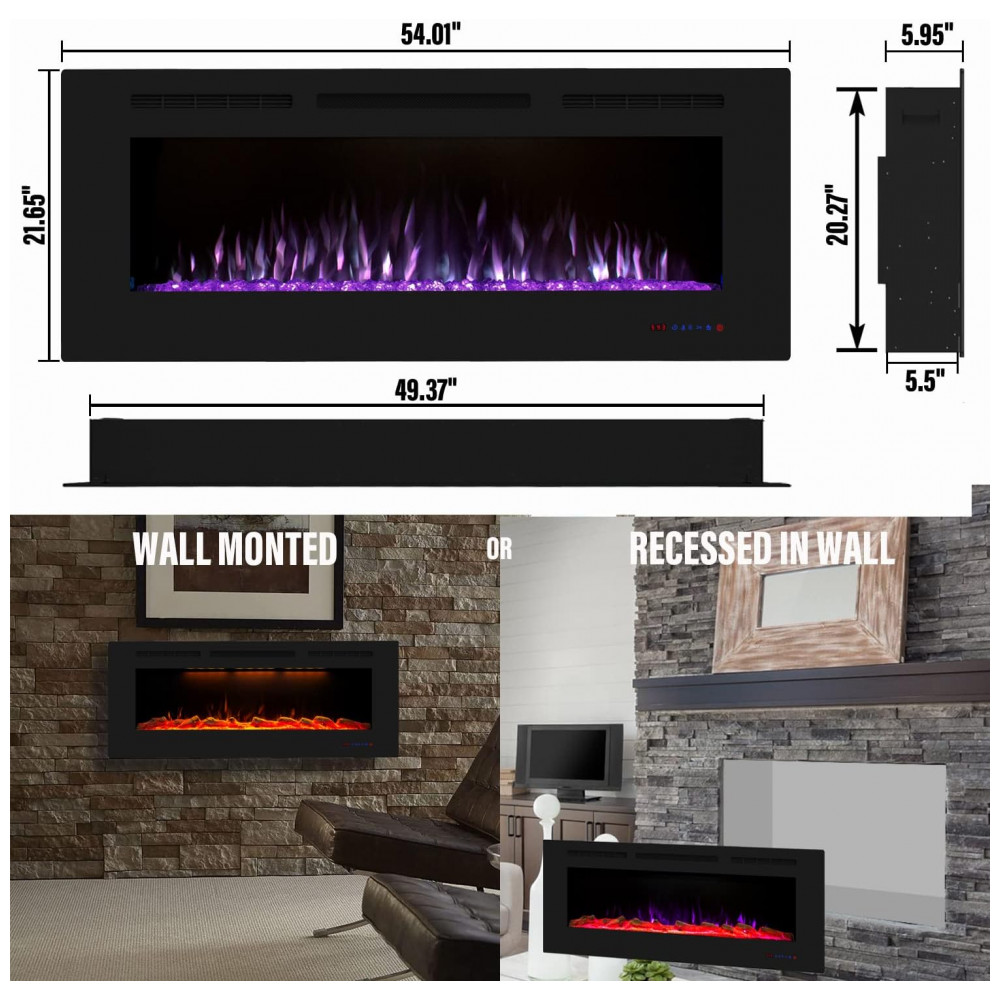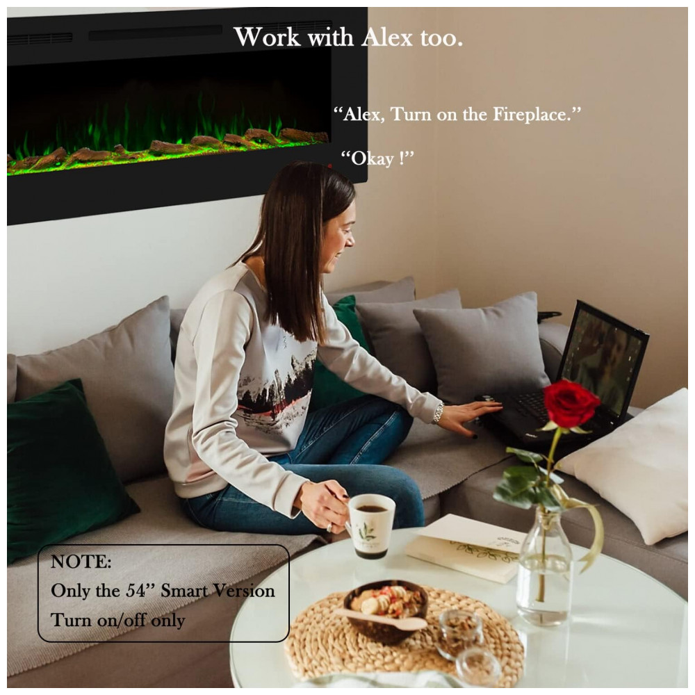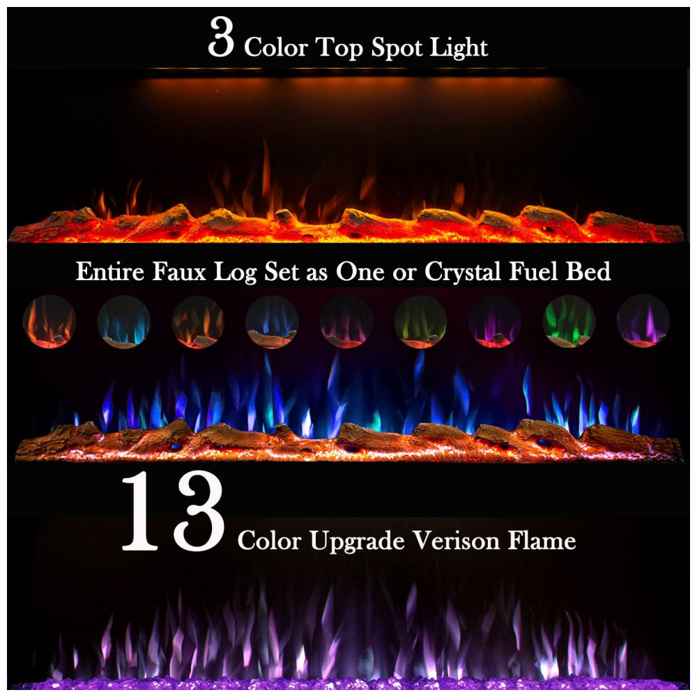 CHAMA REALISTA DE VÁRIAS CORES: 13 cores de chama ajustáveis e 3 luzes superiores estão disponíveis para a lareira inteligente. Várias combinações de cores atendem às suas diferentes necessidades de ambiente. Cores LED de espectro completo e alta intensidade refletem nas pedras de cristal e no conjunto de lenha longa, criando um efeito incrivelmente realista durante o dia e a noite.