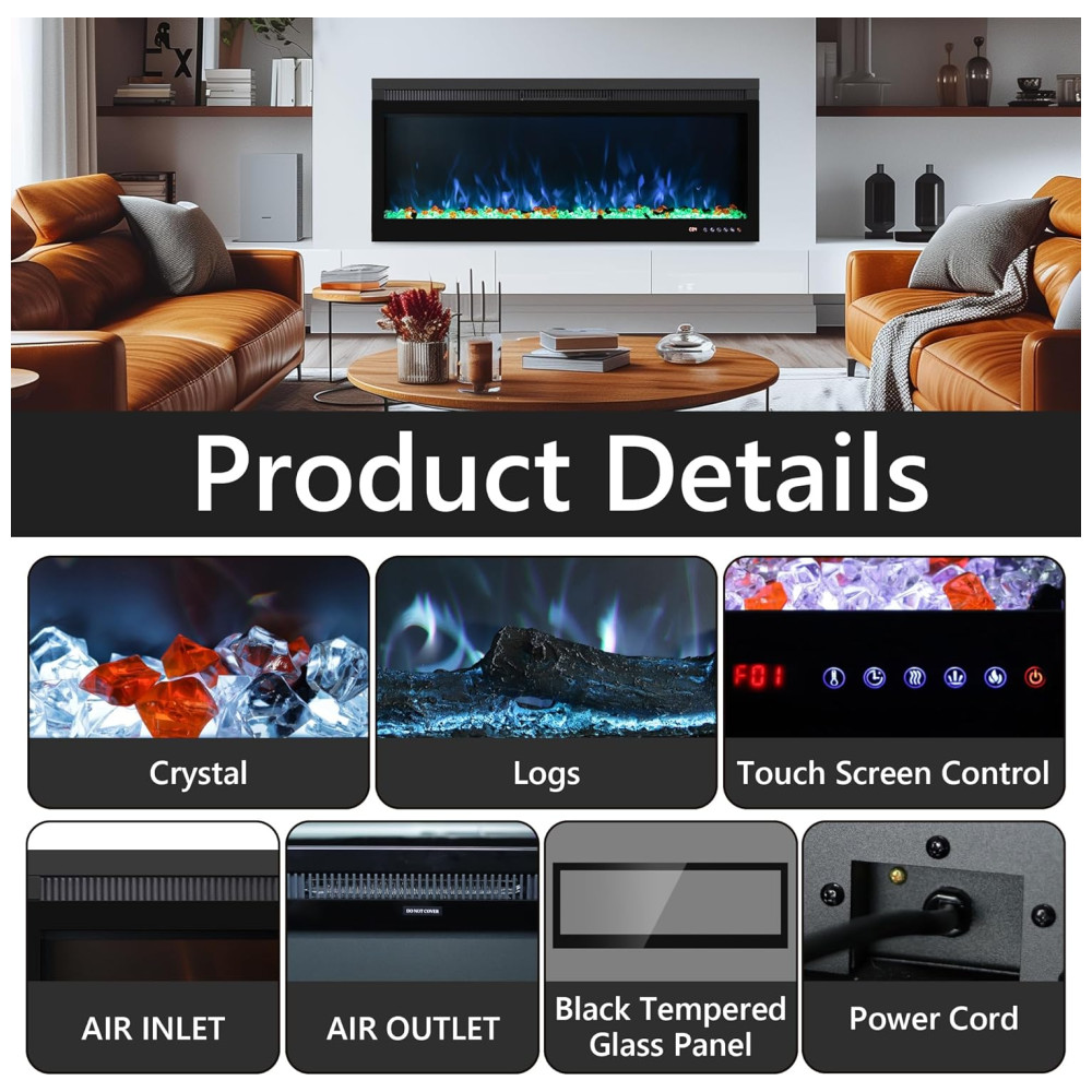 Este aquecedor de lareira elétrica é a combinação perfeita de inovação e estilo, ideal para diversos ambientes. Com uma estrutura em metal premium e um painel de vidro temperado ultrafino, ele oferece um visual moderno e sofisticado que se encaixa bem em qualquer decoração.