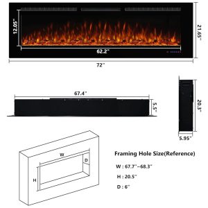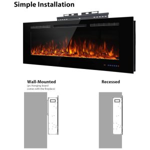 Este aquecedor de lareira elétrico oferece instalação simples e operação eficiente. Ele pode ser embutido na parede ou montado nela, proporcionando uma decoração moderna e elegante para sua casa. Ao optar por embutir a lareira na parede, certifique-se de verificar as dimensões do encaixe conforme indicado na imagem.