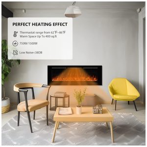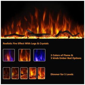 A lareira elétrica oferece um aquecimento rápido, com duas opções de potência (750W e 1500W), proporcionando conforto e economia de energia. Ela conta ainda com um modo de chama múltipla, oferecendo 3 cores e 5 intensidades ajustáveis, além de 3 tipos de mídia de leito de brasas que podem ser combinados livremente. Isso cria uma atmosfera elegante e requintada em sua casa. A temperatura é ajustável em 15 níveis, variando de 62°F a 86°F (de 16°C a 30°C), sendo ideal para espaços de até 37 m² (400 pés quadrados).