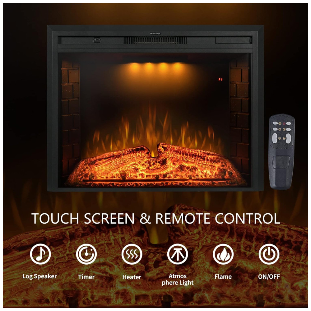 CHAMA REALISTA A lareira elétrica embutida com calor substitui as lareiras tradicionais pela tecnologia LED de economia de energia, sem fumaça e sem cinzas. Chamas realistas e efeitos de lenha queimando, exalando calor e luz. Modos de suspensão com todas as luzes apagadas durante o aquecimento.