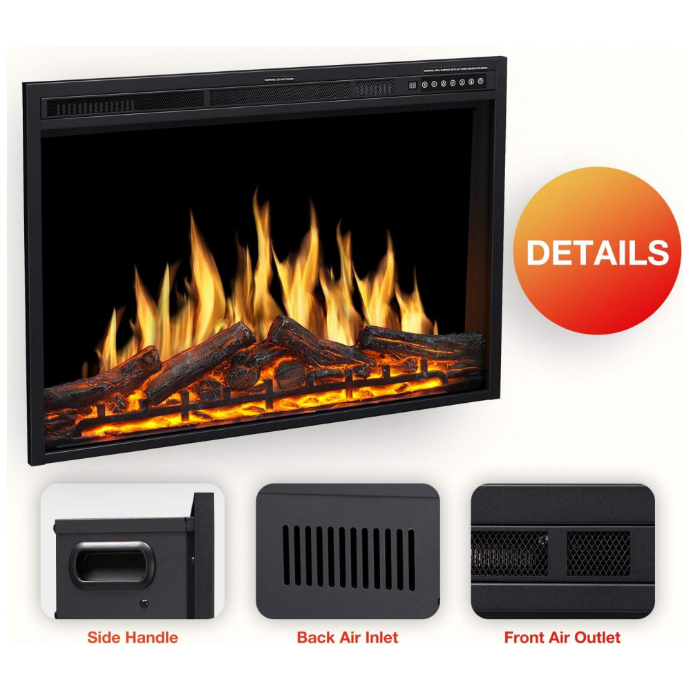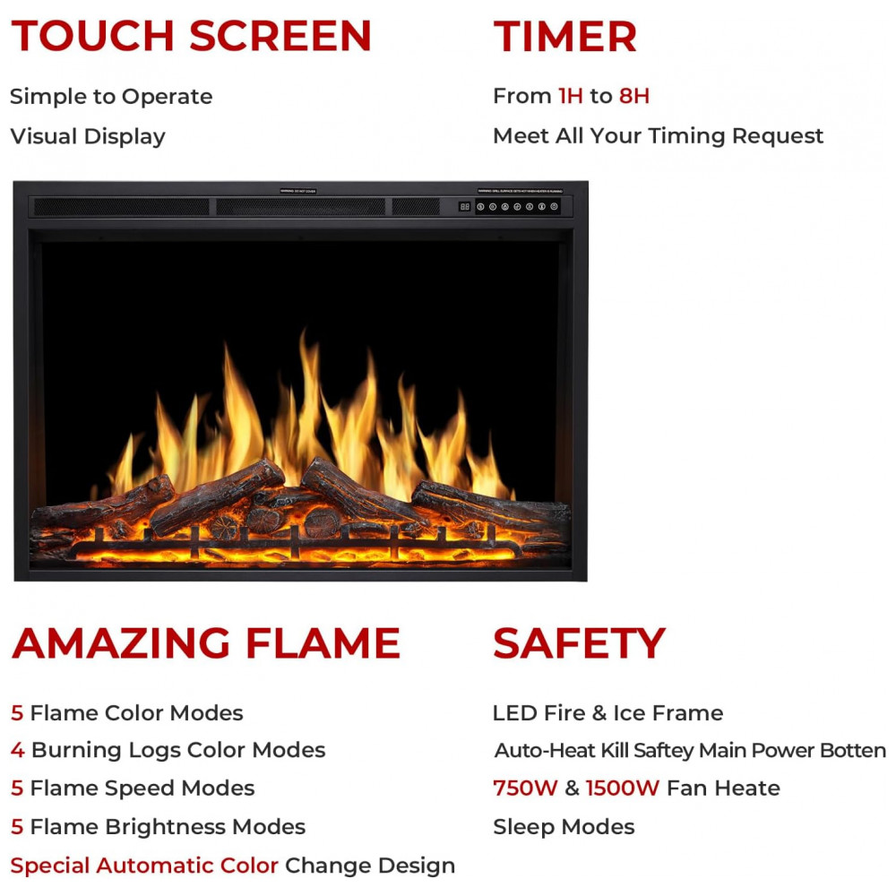 MÚLTIPLOS MODOS DE OPERAÇÃO Tela sensível ao toque no painel frontal 3 modos de cor de toras de chama e queima 5 modos de velocidade de chama 5 níveis de brilho de chama Design especialmente automático a cor e o brilho da chama mudam automaticamente Controle de temporizador de 1 hora a 8 horas 8m distância operacional do controle remoto modos de suspensão com todas as luzes apagadas durante o aquecimento.
