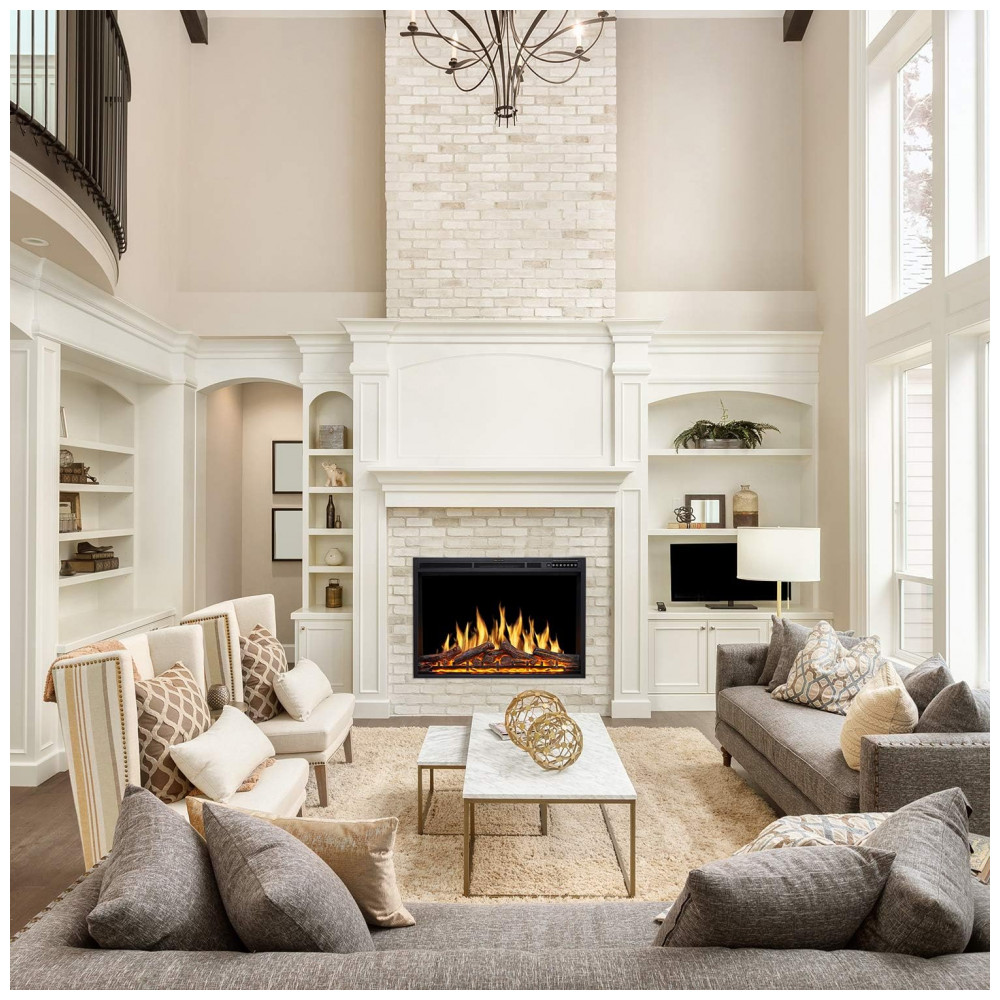 DESIGN DE MODA Design de parede de tijolo interior de dois lados. Construído com vidro temperado de de espessura e acabamento preto, coordenado com lindas chamas dançantes realistas e efeito de lenha em chamas. Dê ao seu quarto um ambiente de sonho