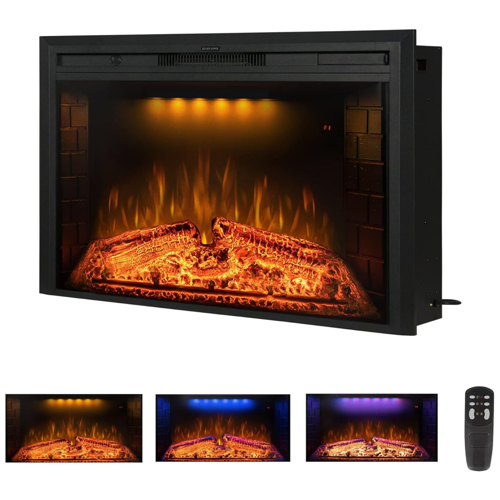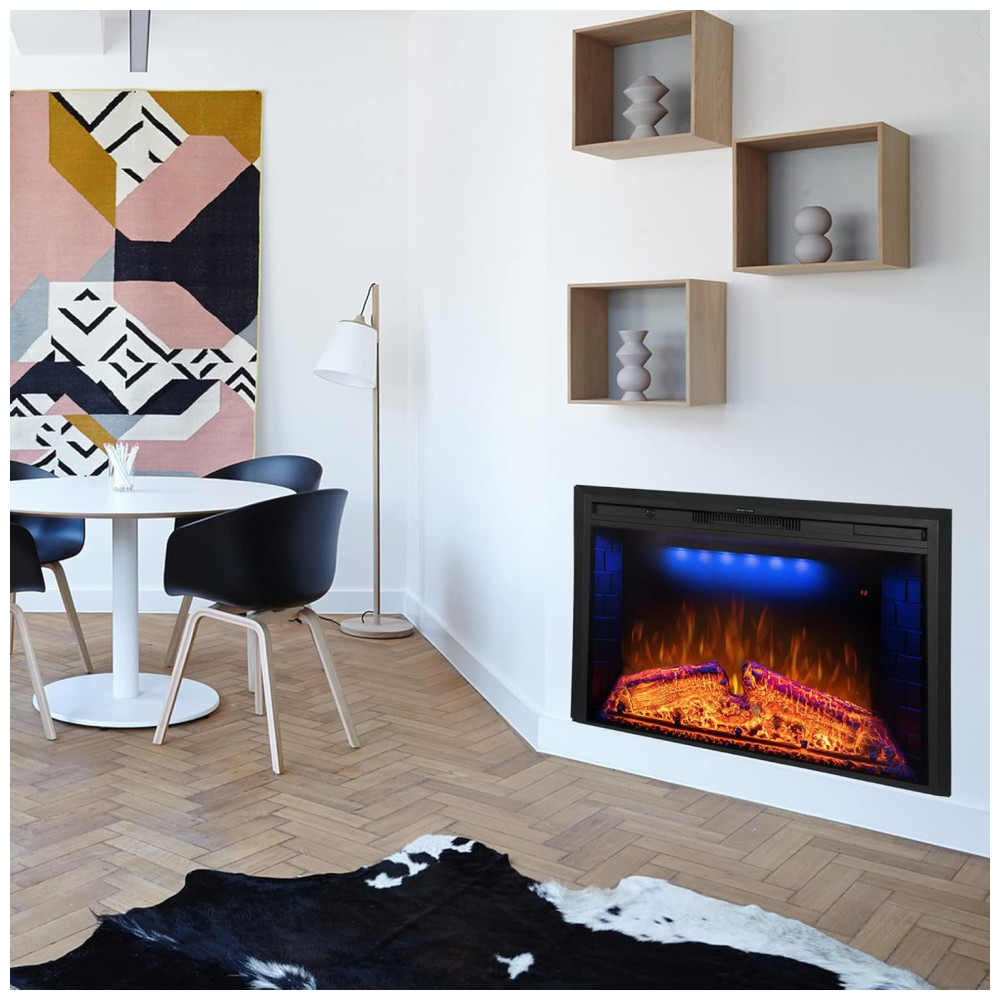 CHAMA REALISTA A lareira elétrica embutida com calor substitui as lareiras tradicionais pela tecnologia LED de economia de energia, sem fumaça e sem cinzas. Chamas realistas e efeitos de lenha queimando, exalando calor e luz. Modos de suspensão com todas as luzes apagadas durante o aquecimento.