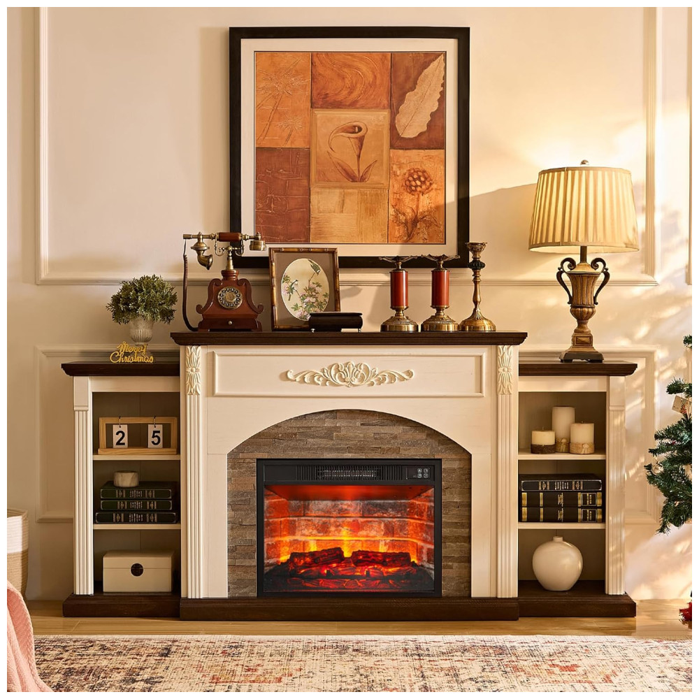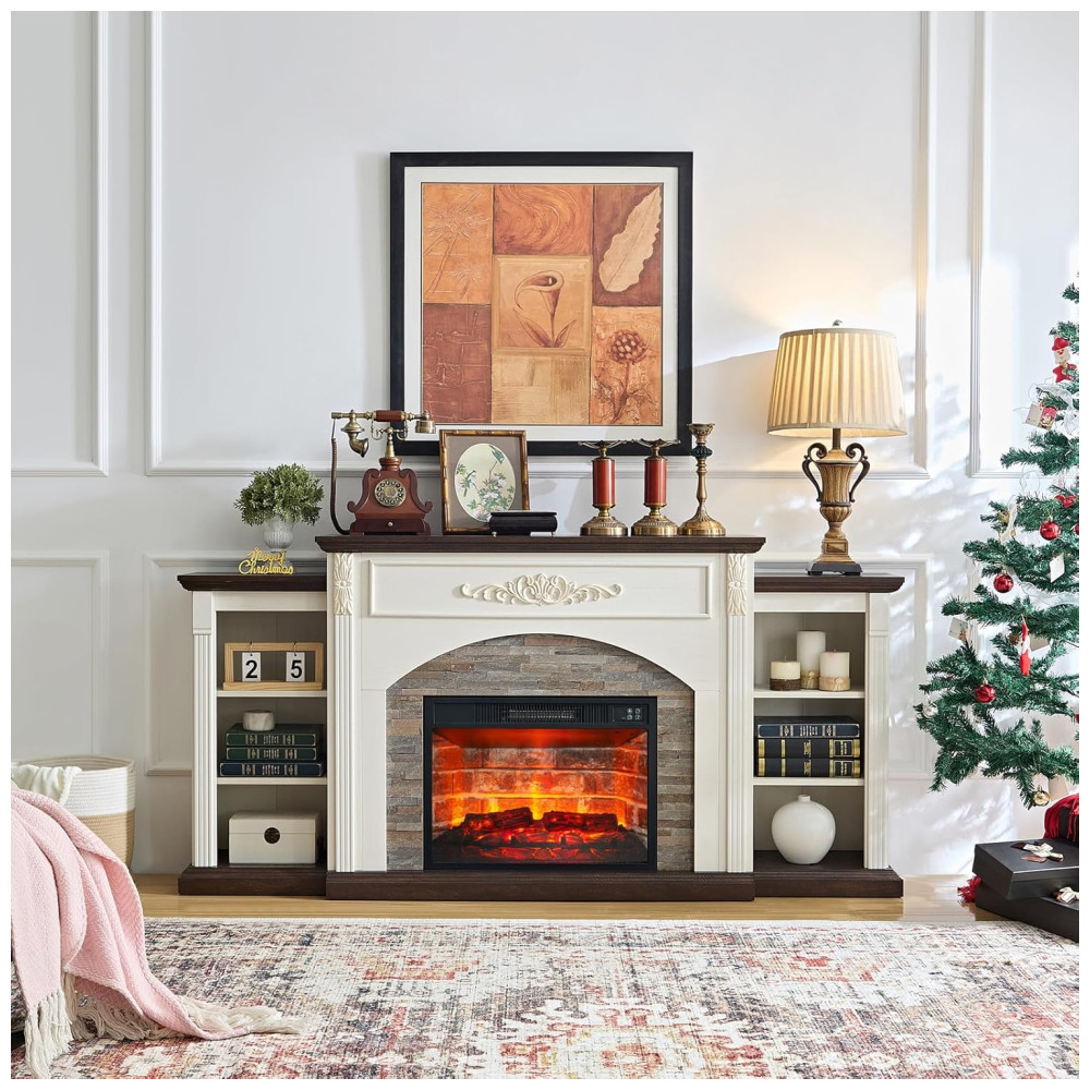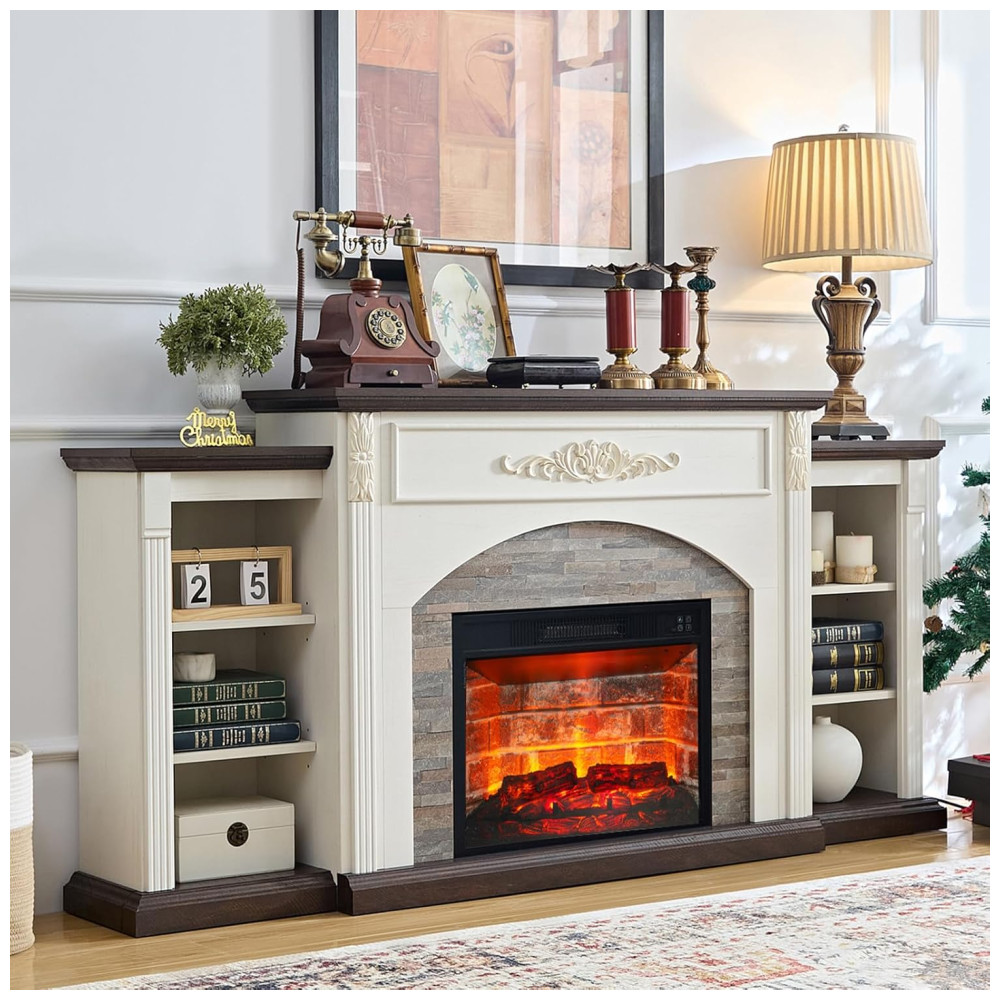 Design Clássico e Vintage Com uma caixa de fogo de canto branca e cercadura de pedra empilhada, feita de madeira de lei de alta densidade e acabamento marrom/branco. As colunas laterais esculpidas conferem um visual refinado, unindo o vintage e o clássico de maneira harmoniosa.