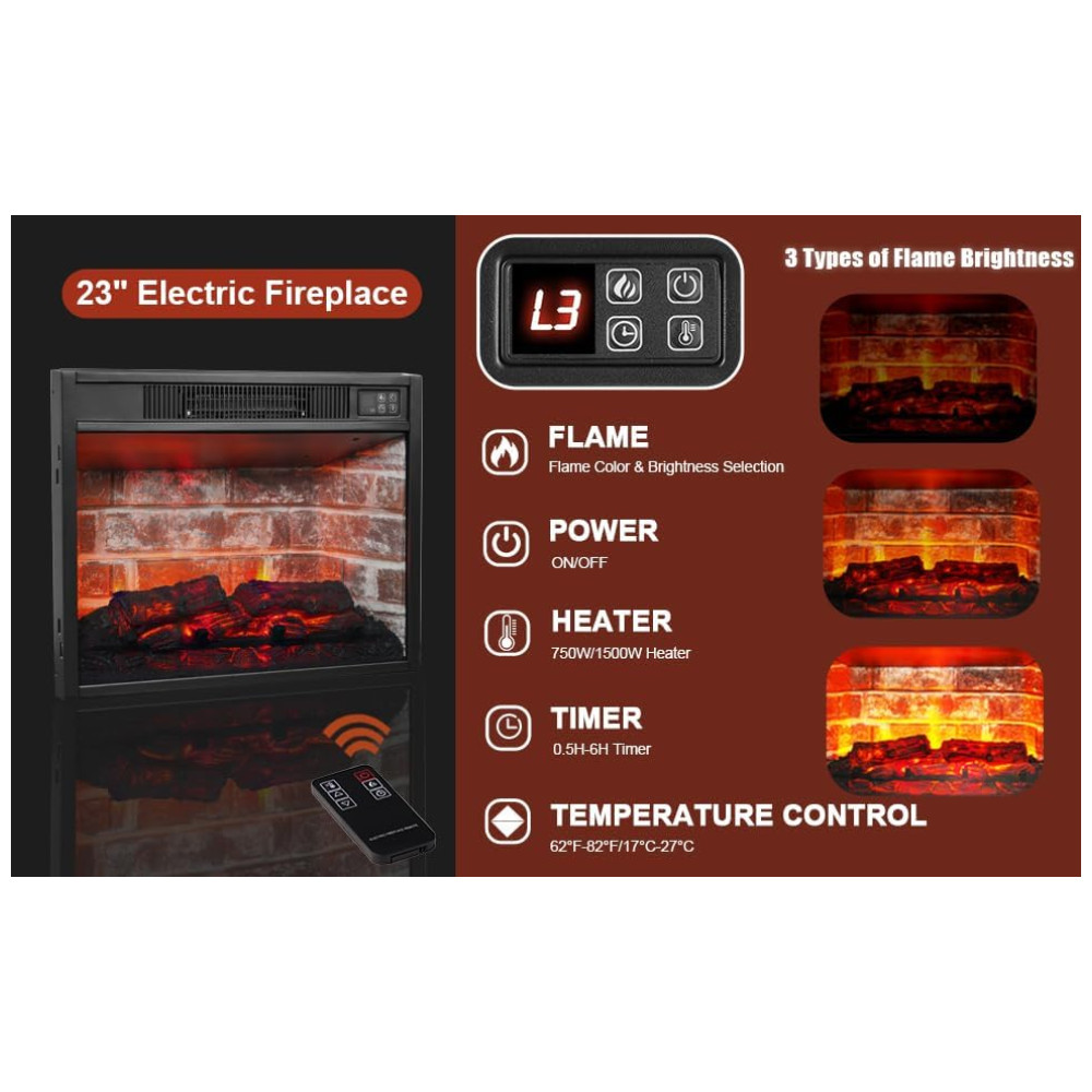 A lareira de embutir de 58 cm apresenta um padrão de tijolos vermelhos, oferecendo três tipos de efeito de chama realista. Perfeita para criar uma atmosfera acolhedora, especialmente durante o Natal. A lareira elétrica também conta com controle remoto e timer programável de até 6 horas, permitindo um uso prático e seguro.