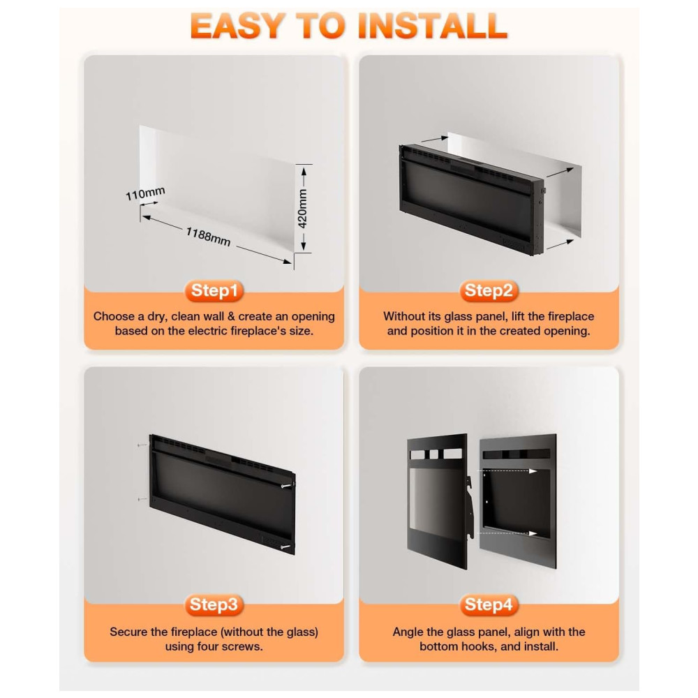 A instalação é versátil, permitindo montagem na parede, embutido em uma parede ou uso independente, adaptando-se a diferentes necessidades e estilos de decoração. O produto vem com um manual de instruções claro e inclui todos os acessórios de hardware necessários para uma instalação rápida e sem complicações.