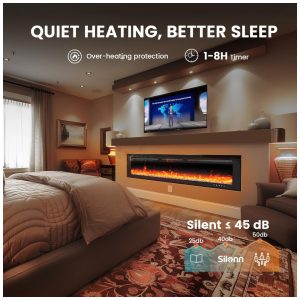 A lareira oferece 20 modos de cor para as chamas, além de um modo de mudança automática de cor, todos com um efeito de cristal deslumbrante. Isso permite criar a atmosfera perfeita para qualquer ocasião, seja para reuniões familiares, festas ou celebrações especiais. A Silonns funciona de forma silenciosa, com um nível de ruído abaixo de 45 dB, garantindo um ambiente tranquilo que não interfere no seu descanso. Inclui ainda uma trava de segurança para crianças e um temporizador de até 18 horas, proporcionando mais segurança e tranquilidade para sua casa e família.