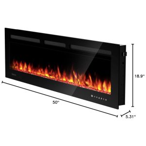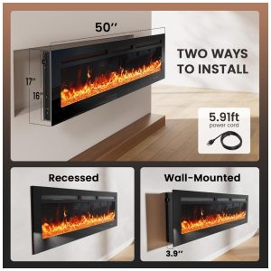 A instalação da lareira pode ser feita de duas formas: na parede ou embutida. A montagem na parede é prática e tem um perfil fino e elegante de apenas 3,9 cm de espessura, economizando espaço. A instalação embutida exige uma estrutura adequada na cavidade da parede. Certifique-se de revisar a seção de instalação embutida nas imagens antes de concluir sua compra.