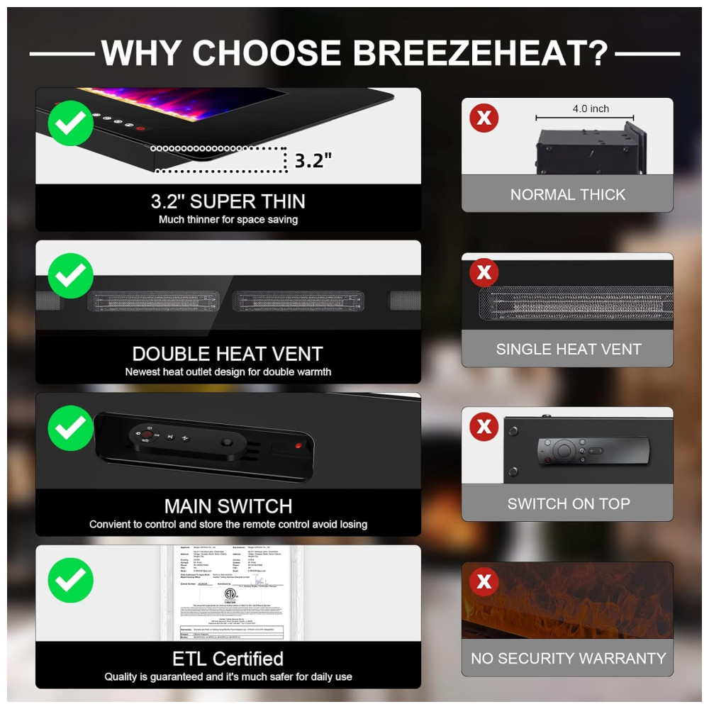 Design Elegante e Moderno: A lareira elétrica Breezeheat é ultra fina (apenas 8,1 cm de espessura) e pode ser montada na parede ou embutida para criar um ambiente aconchegante e elegante em qualquer espaço. Com uma superfície de vidro temperado preto e uma estrutura de aço escuro, ela se integra perfeitamente à decoração moderna.