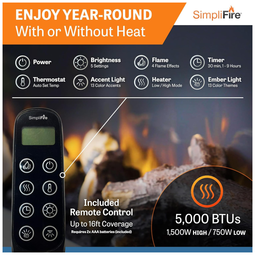 O controle remoto intuitivo oferece total controle sobre o aquecimento, as chamas e as opções de iluminação, permitindo ajustes rápidos com facilidade. Além disso, o visor de chamas pode ser operado de forma independente do aquecedor de 5000 BTU, o que permite aproveitar os efeitos visuais mesmo nos meses mais quentes, garantindo diversão e ambiente aconchegante durante todo o ano.