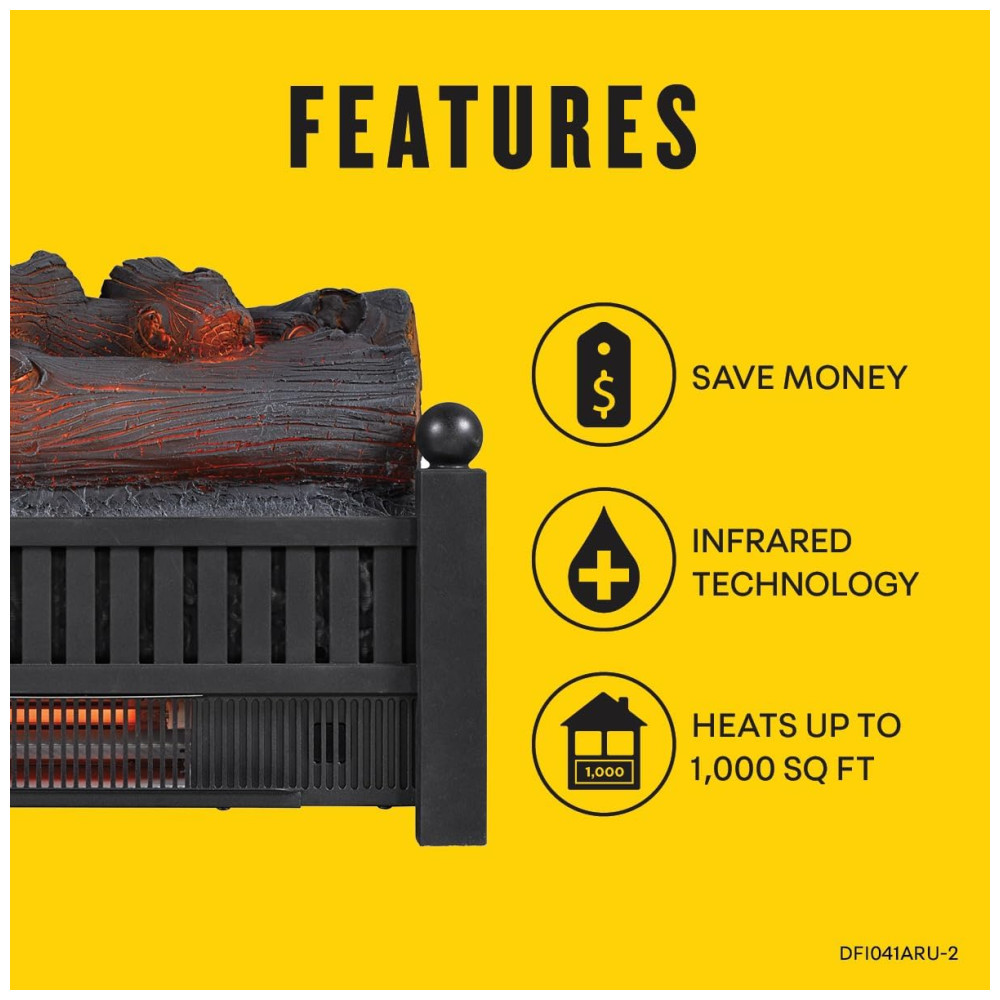 Transforme sua lareira em um ambiente acolhedor e aconchegante com o aquecedor elétrico infravermelho Duraflame Juniper Log Set com som crepitante. Este conjunto permite que você desfrute das chamas dançantes e dos sons crepitantes de uma lareira a lenha sem a bagunça associada. As toras de zimbro realistas e o canteiro de brasas estão dispostos em uma grelha de fogo com acabamento preto, proporcionando um efeito de chama rolante que pode ser utilizado com ou sem calor, além dos sons de fogo crepitante.