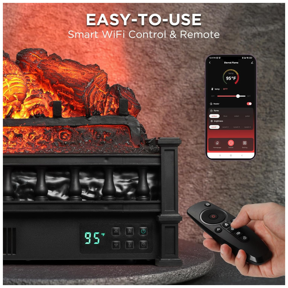 Equipado com controle WIFI inteligente, permite ajustar a temperatura e as chamas de qualquer lugar da casa. Também apresenta som de crepitação realista em 3 níveis. É uma opção econômica para o inverno, proporcionando aquecimento eficiente, e pode ser usado apenas para desfrutar das chamas realistas durante todo o ano, sem necessidade de instalação complexa.