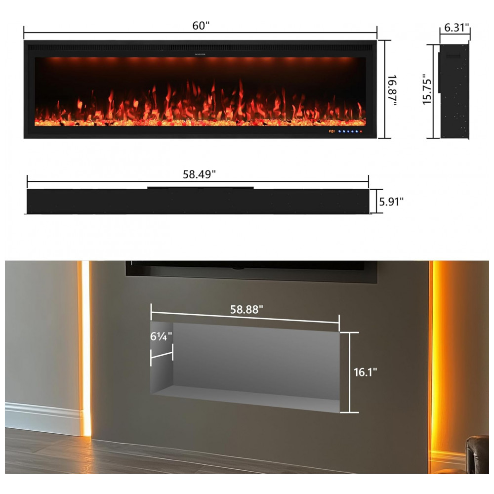 Lareira Elétrica Embutida Valuxhome de 1524 cm Design de Moldura Ultra Estreita 13 Cores de Chamas Aquece até 37m²