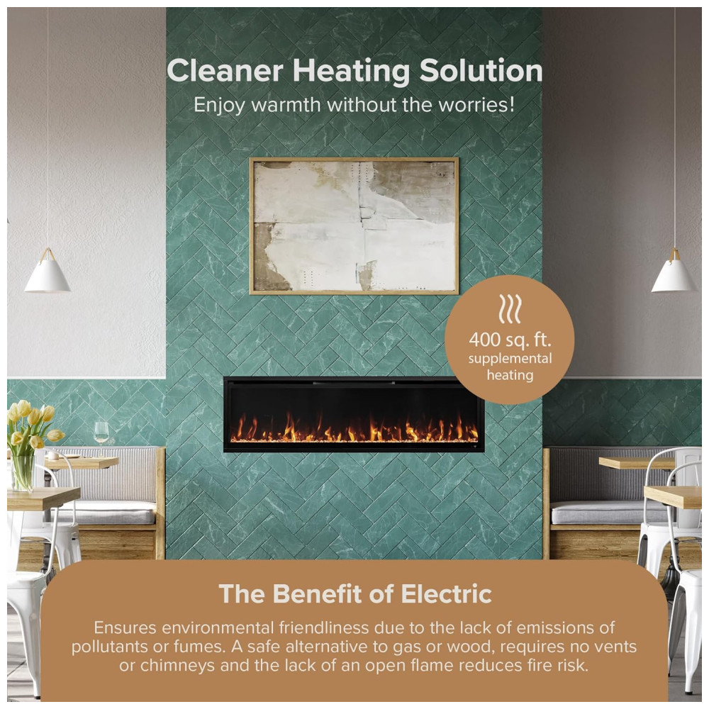 A lareira elétrica linear Aerus Slim pode ser instalada de duas formas diretamente na parede ou embutida em uma parede com moldura de 2×4 para uma aparência nivelada. O controle remoto incluído permite ajustar facilmente as configurações de calor, cor da chama e ligar o dispositivo, além de conectá-lo ao WiFi com assistentes domésticos como Alexa e Google. É possível definir a temperatura ambiente desejada, desligar completamente o aquecimento durante o verão e controlar as chamas com ou sem som de crepitação integrado. A lareira vem com brasas de cristal de madeira de floresta inclusas e possui chamas de LED ajustáveis em 5 cores vibrantes, 5 níveis de brilho, 3 velocidades de chama e 10 tons de leito de brasas. Existem 5 opções de fiação disponíveis, incluindo a conexão em uma tomada de 110V com cabo de 1,82 metros e o kit de plugue incluído. É importante ter cuidado com a instalação da fiação.