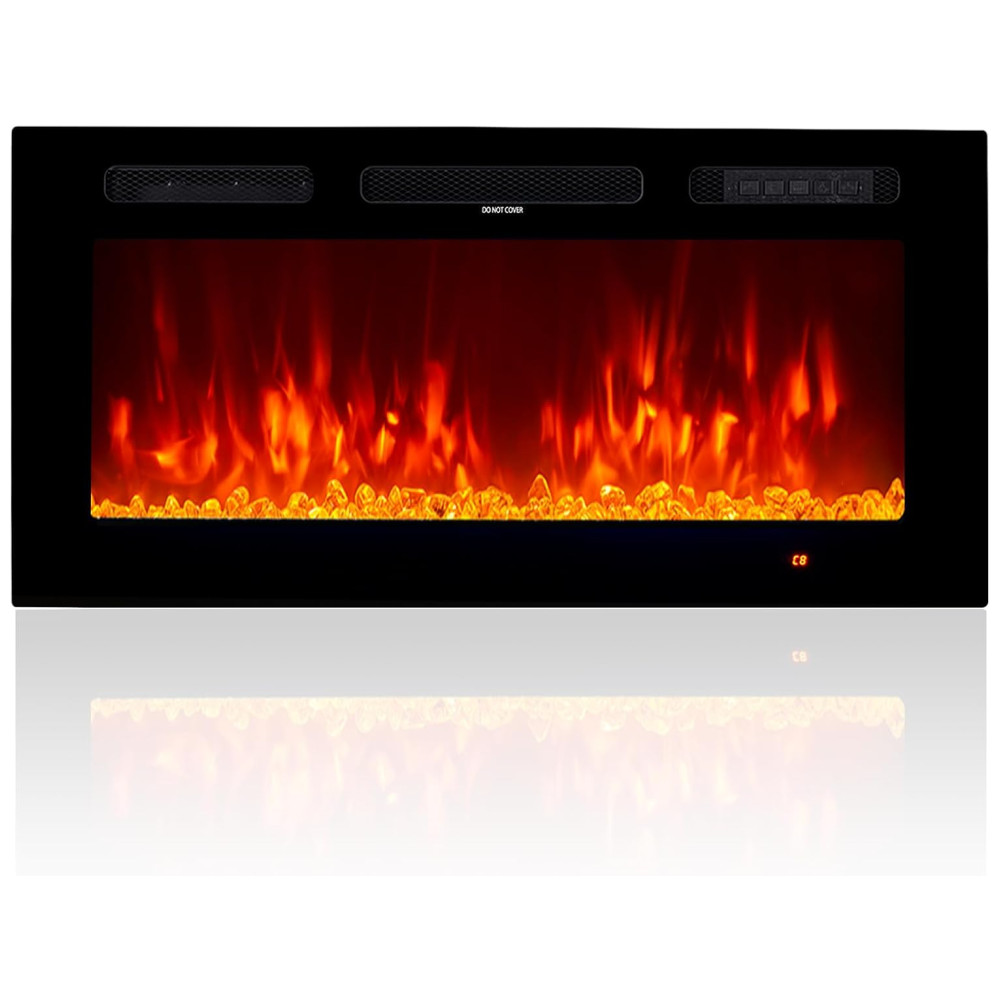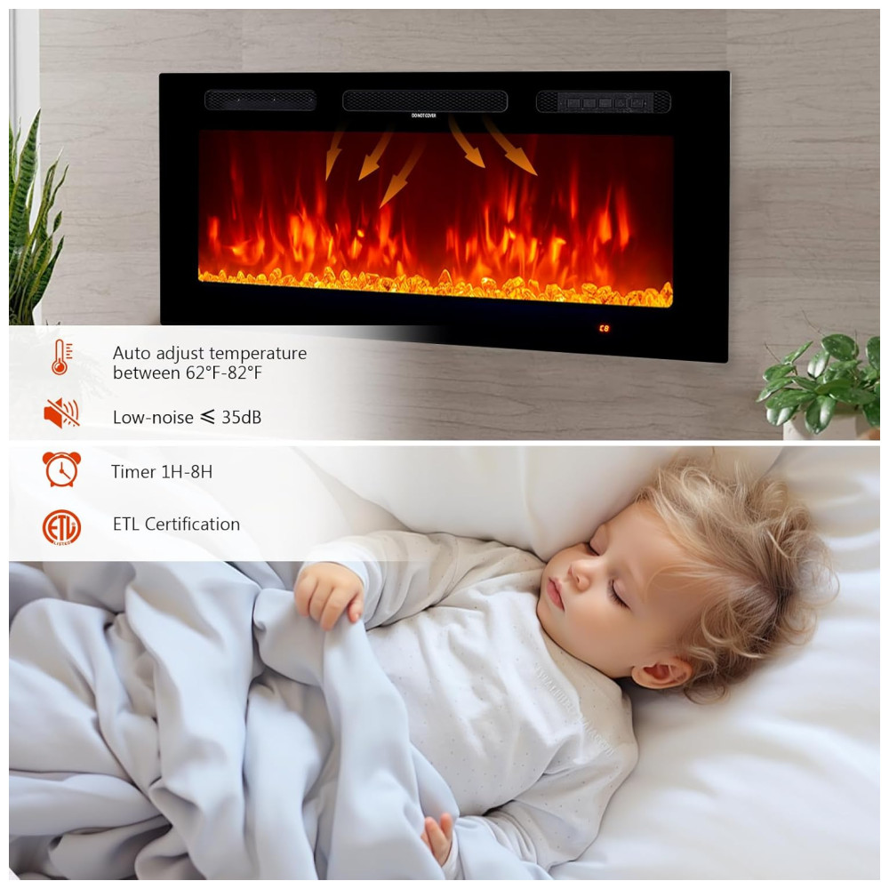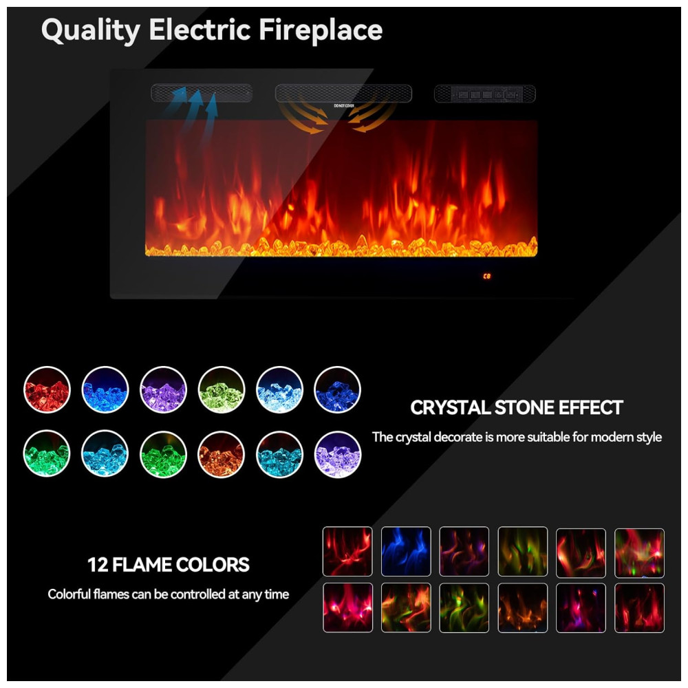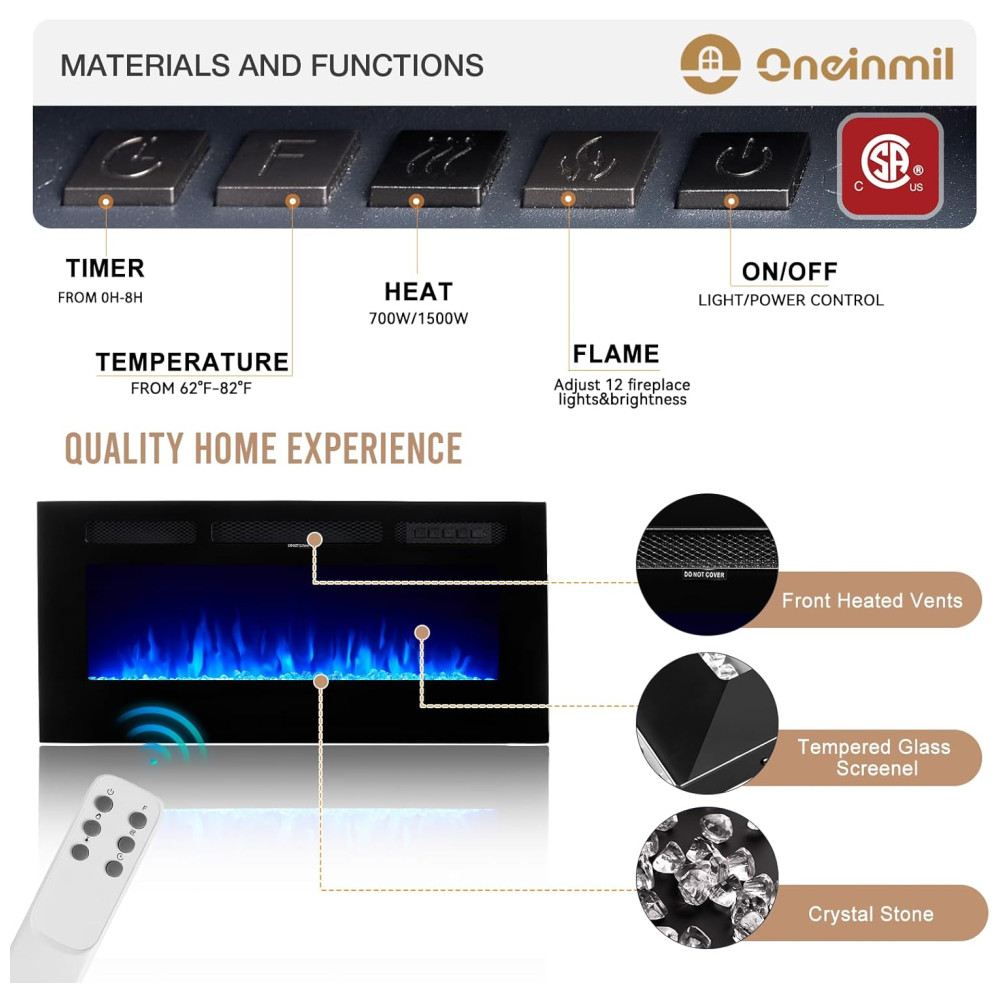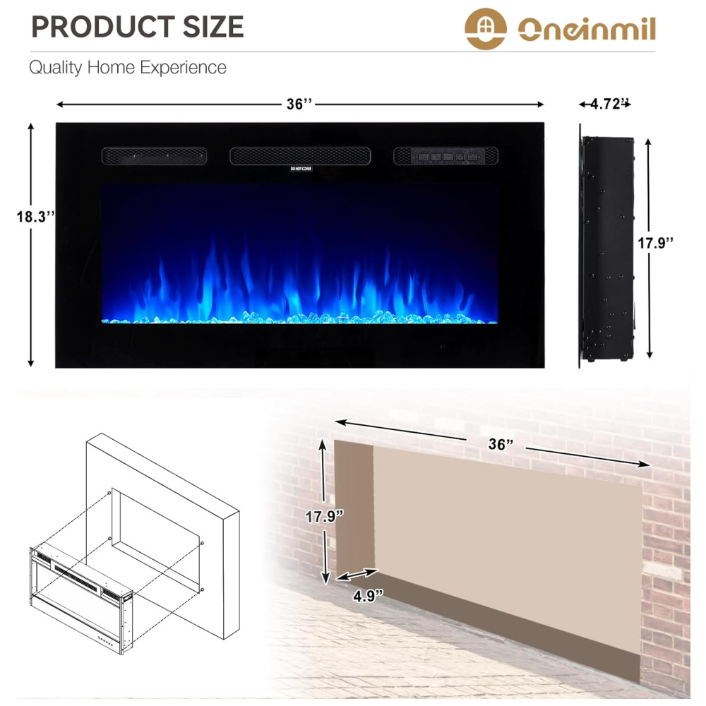 A Lareira Elétrica oneinmil é uma peça de decoração de alta qualidade para o lar, com dimensões de 91,44cm de largura x 12cm de profundidade x 46,5cm de altura. Seu design fino, estrutura robusta e painel frontal de vidro temperado plano se integram facilmente ao design da casa. Além de proporcionar um ambiente acolhedor e interessante ao seu cômodo, é uma excelente escolha tanto para fins estéticos quanto de aquecimento. Com modos de controle flexíveis, controle remoto e tela sensível ao toque, torna-se mais conveniente controlar cada função da lareira elétrica, como ligar/desligar, timer de 18 horas, controle independente de aquecimento e chama, ajuste de cor e velocidade da chama, e função de modo de sono. O aquecimento rápido e seguro da zona suplementar pode cobrir até 37m², garantindo que o ambiente fique quente em poucos minutos. Além disso, a lareira elétrica possui um termostato que monitora automaticamente a temperatura da tomada para garantir sua segurança. Com opções de ajuste de cor da chama e da pedra de cristal separadamente, a lareira oferece uma iluminação personalizada para criar a atmosfera desejada. A chama com 12 cores de LED intercambiáveis, tela sensível ao toque e controle remoto permitem operar a chama com ou sem calor para desfrutar durante as quatro estações do ano. Vale ressaltar que a lareira aquecerá um cômodo fresco, porém não substituirá uma fonte de calor principal. Mantenha materiais combustíveis, como móveis, almofadas, roupas de cama, papéis e cortinas, a pelo menos 0,9m de distância da frente da lareira, bem como dos lados e da parte traseira.