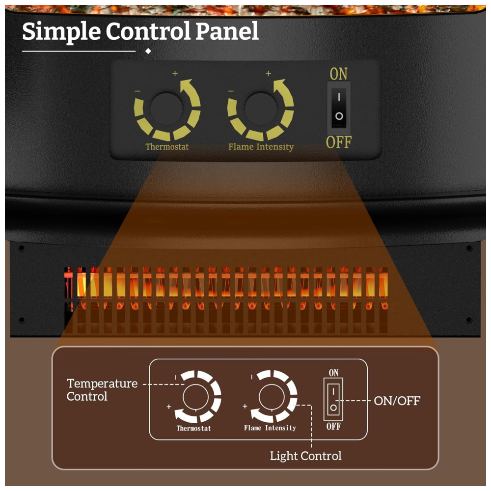 Painel de Controle de Fácil Uso: É muito fácil e conveniente abrir a porta e ajustar o termostato e o brilho da chama com o botão no canto inferior direito do aquecedor de lareira elétrica. Você pode ajustar os diferentes efeitos visuais e temperaturas para garantir que você e seus entes queridos possam relaxar e desfrutar do brilho quente da atmosfera.