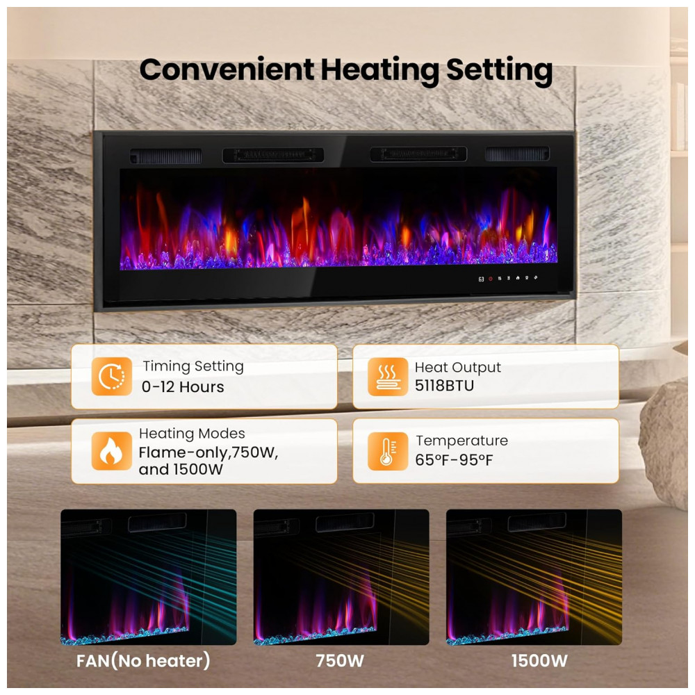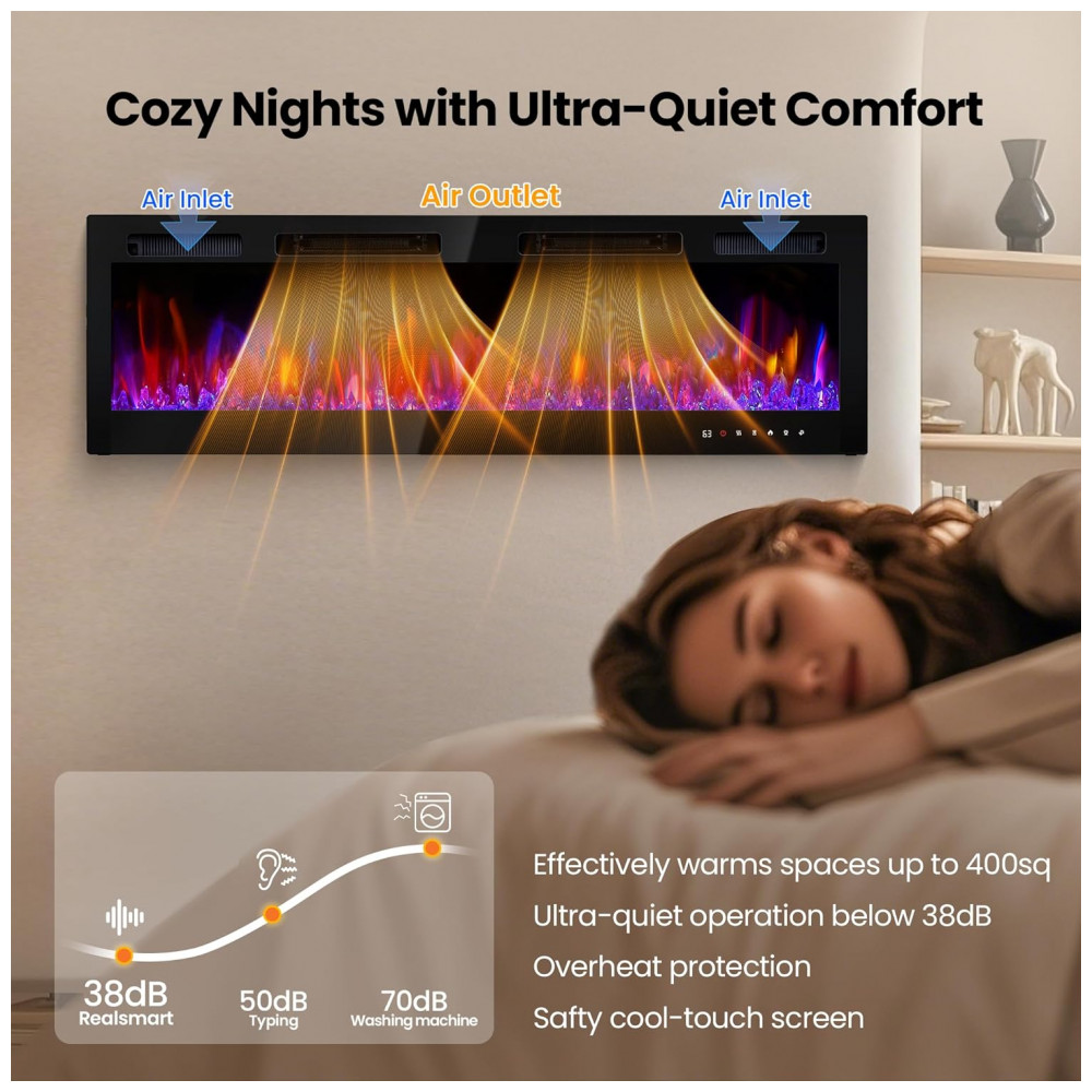 Lareira Elétrica RealSmart 1524 cm com Aquecedores Inserts Montados na Parede 750W/1500W Embutidos na Parede com Controle Remoto Timer