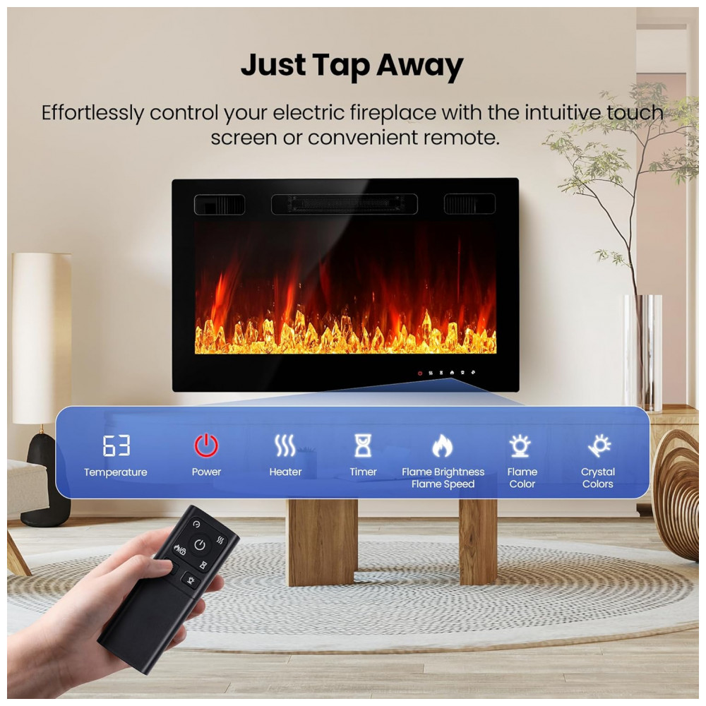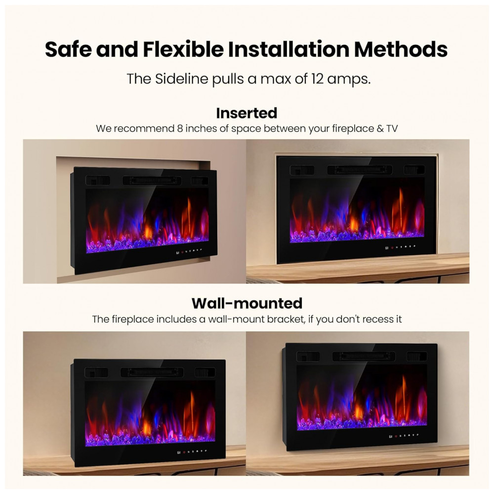 Os aquecedores RealSmart oferecem múltiplas opções de instalação: totalmente embutida, parcialmente embutida e montada na parede. Com efeitos de chama realistas, 12 cores de chama dinâmicas, 12 cores de base sólida e controle de brilho e velocidade, essa lareira elétrica proporciona calor aconchegante e uma atmosfera acolhedora. Seu design moderno e elegante, com tela de alta proporção, vidro temperado e perfil fino, se integra perfeitamente à decoração. Controle inteligente, ampla área de cobertura, ajuste de temperatura, brilho e timer, além de opções de aquecimento de 750W e 1500W, tornam essa lareira ideal para todas as estações. Equipada com desligamento automático e proteção contra superaquecimento, mantendo a umidade natural do ambiente. Funcionamento silencioso a 38 decibéis, garantindo conforto e tranquilidade.