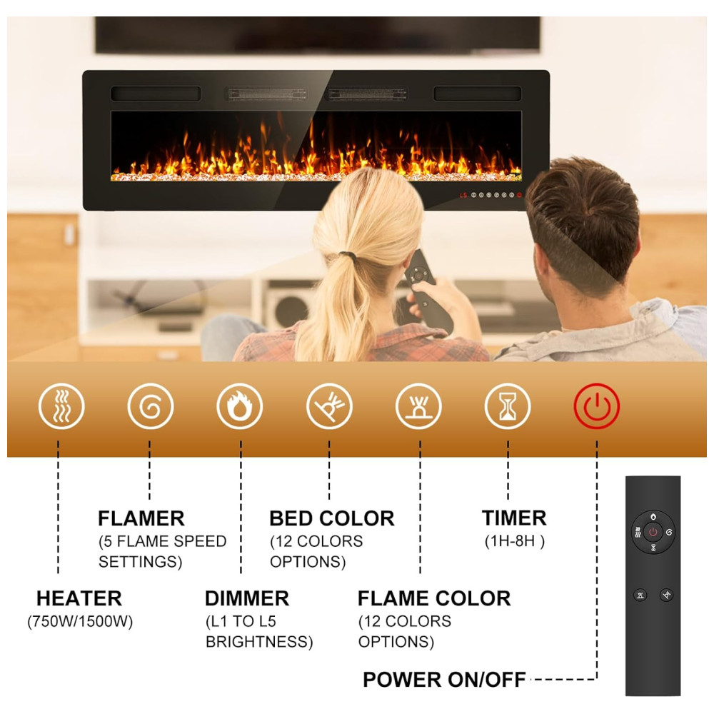 Esta lareira LED personalizável oferece a opção de escolher entre 12 cores de chama, 12 cores de leito de chama, 5 modos de velocidade de chama e 5 níveis de brilho de chama através do controle remoto fornecido. Com apenas 8,13 cm de espessura, ela é 20 mais fina que outras lareiras, o que a torna fácil de instalar e usar. Você pode escolher a temperatura desejada entre dois modos 750W ou 1500W. Esta lareira elétrica pode ser embutida ou montada na parede, o que a torna versátil e elegante. Aprovada pela ETL, esta lareira elétrica atende aos mais altos padrões de segurança e qualidade, possui um recurso de eliminação automática de calor integrado que evita o superaquecimento e mantém o ar úmido e aconchegante para que você possa aproveitar o conforto desta lareira sem preocupações. Esta lareira é ideal para uso comercial e de escritório, além de ser perfeita para sua casa. Adquira agora e presenteie você e seus entes queridos com um presente caloroso e maravilhoso.
