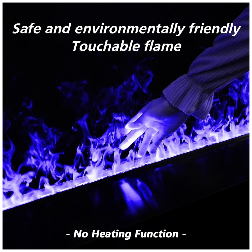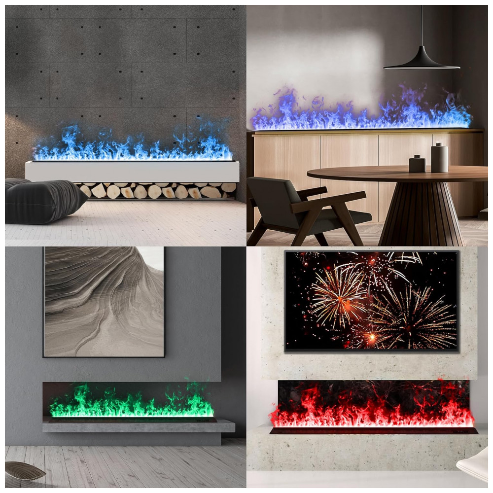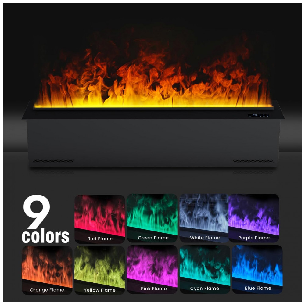 Lareira elétrica recessível com atomização de vapor d’água iluminada por LEDs RGB multicoloridos para simular chamas realistas, utilizando controle manual de água e sistema inteligente de nebulização para efeito consistente. Inclui controle remoto para ajuste de intensidade de chama e cores (9 configurações), cabo de alimentação de 1,5 m e operação via fonte AC com soquete padrão americano. Estrutura metálica com acabamento em pó permite instalação embutida com distância mínima de 45 cm ao gabinete superior para otimização da atomização, ventilação livre e orientação frontal, compatível com ambientes internos residenciais e comerciais.