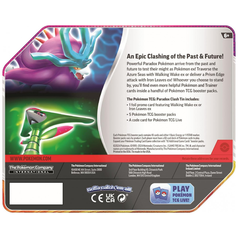 Lata de cartas Pokémon TCG Paradox Clash The Pokémon Company multicolorida com Walking Wake EX ou Iron Leaves EX – Cartas Exclusivas e 5 Boosters