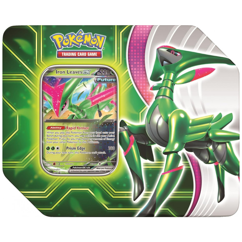 Conteúdo da lata: 1 carta promocional foil Walking Wake ex ou Iron Leaves ex, 5 boosters Pokémon TCG, 1 código para Pokémon TCG Live