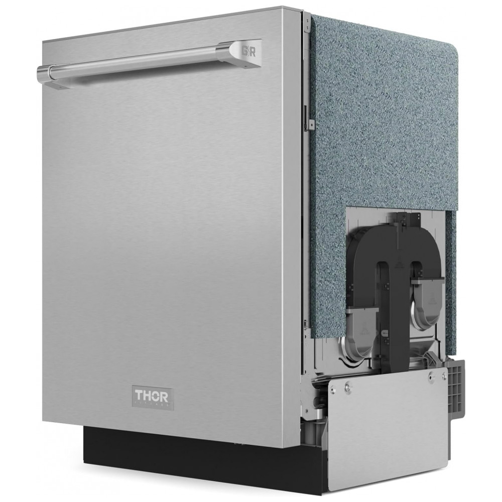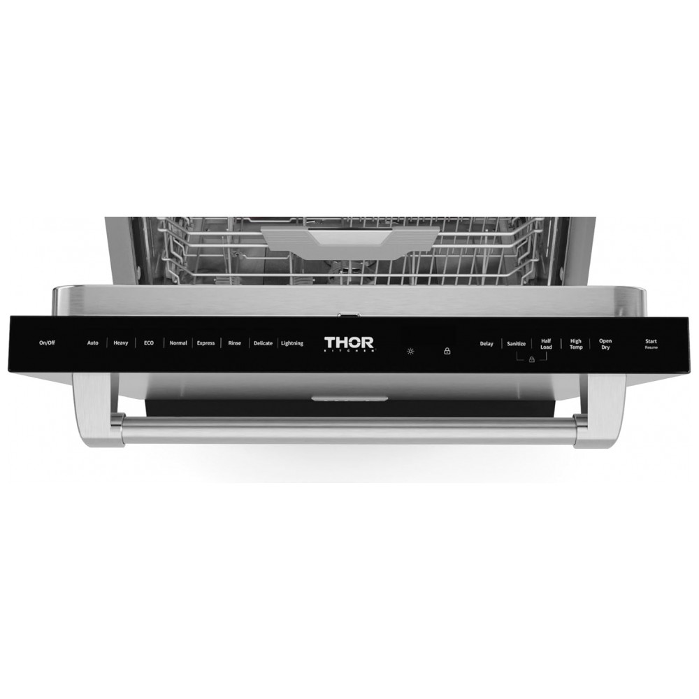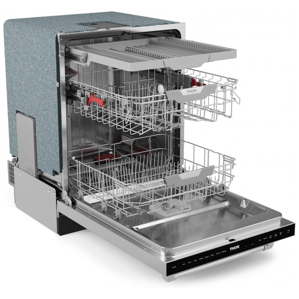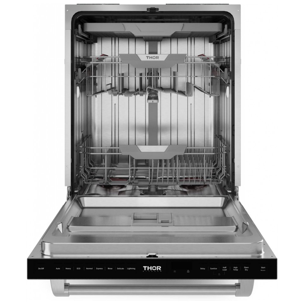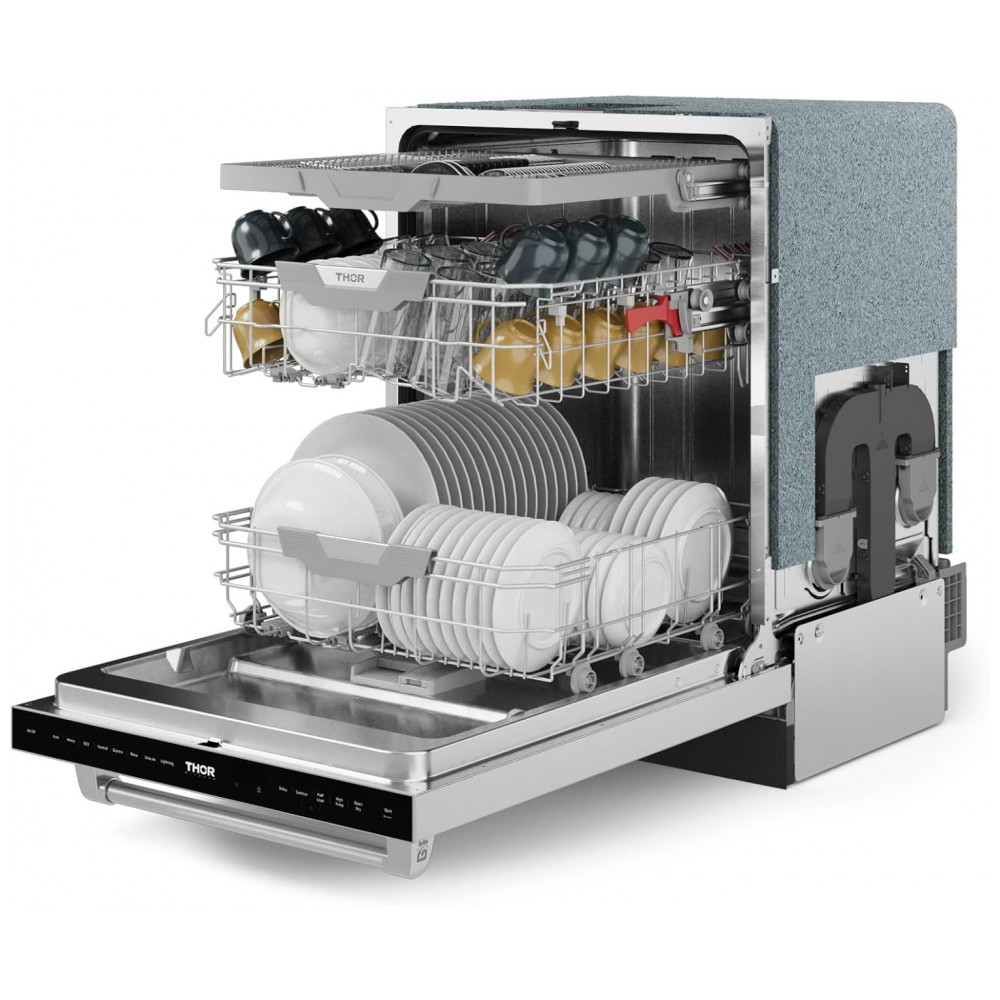 O lava-louças de embutir 60 cm Thor Kitchen série Gordon Ramsay em aço inox oferece capacidade para 15 serviços com nível de ruído de 49 dB. A cuba interna em aço inox e sistema de três cestos otimizam a organização de louças e utensílios. O painel de controle por toque com display LED permite seleção precisa de ciclos e opções.