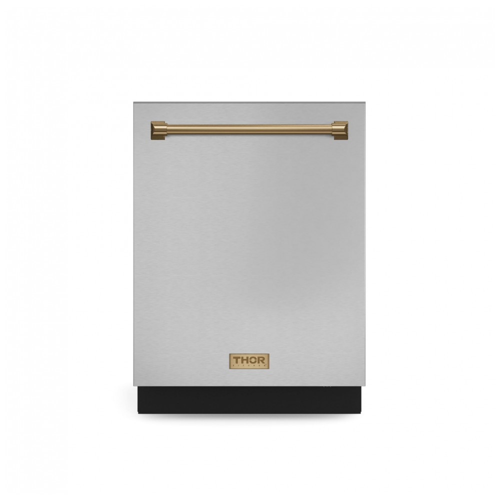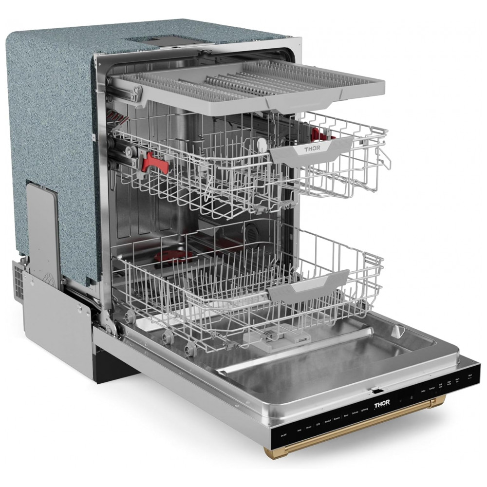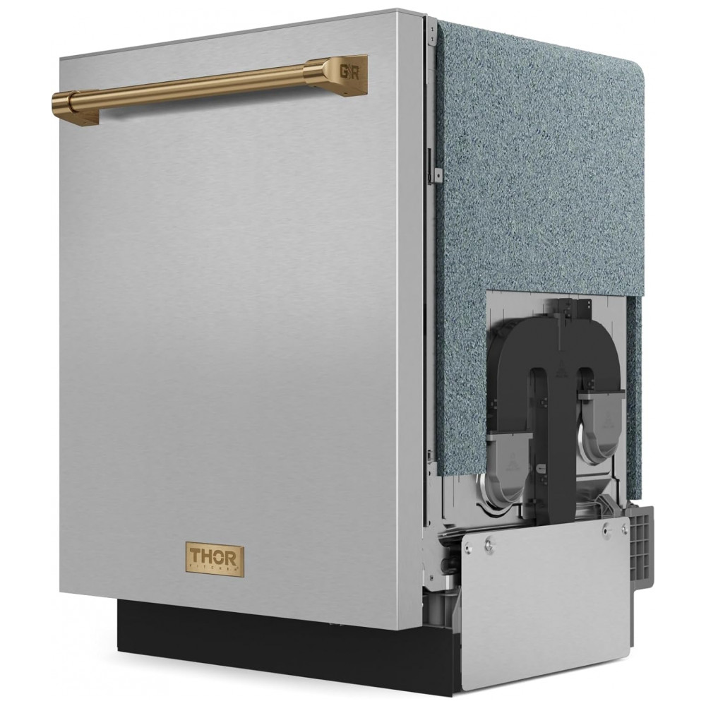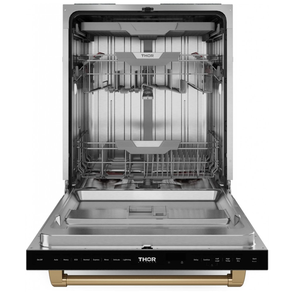 A lava-louças embutida Gordon Ramsay Series by THOR Kitchen de 24 polegadas foi projetada para instalação em nichos padrão de cozinha, com painel frontal em aço inoxidável e puxador em acabamento bronze que compõem um conjunto de estilo profissional. A capacidade interna permite acomodar até 15 serviços, distribuídos em cestos ajustáveis e um terceiro nível para talheres e utensílios menores, otimizando o uso do espaço interno.