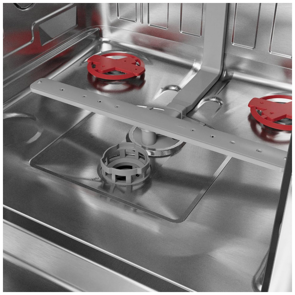 O equipamento conta com 8 ciclos de lavagem, incluindo modos como Auto, Heavy, Eco, Normal, Express, Rinse, Lightning e Delicate, cobrindo desde panelas mais sujas até vidros e louças delicadas. Os três braços aspersores (superior, intermediário e inferior) promovem distribuição de água em vários níveis, auxiliando na cobertura uniforme dos itens posicionados em todos os cestos.