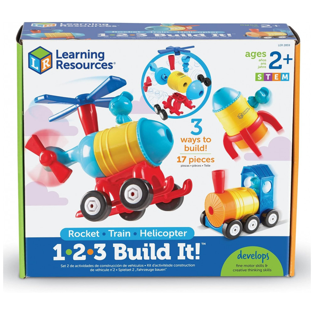 O kit Learning Resources 1-2-3 Build It! Rocket, Train, Helicopter oferece diversão educativa para crianças pequenas, com peças robustas e coloridas que podem ser montadas para criar três veículos distintos — um foguete futurista, um trem clássico e um helicóptero divertido.