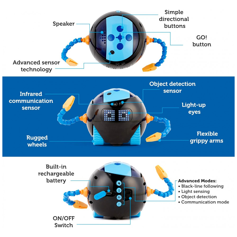 Características: codificação sem tela, 40 cartões de codificação, 10 desafios educativos, 4 modos de jogo interativos, sensor óptico, sensor de luz, detector de obstáculos