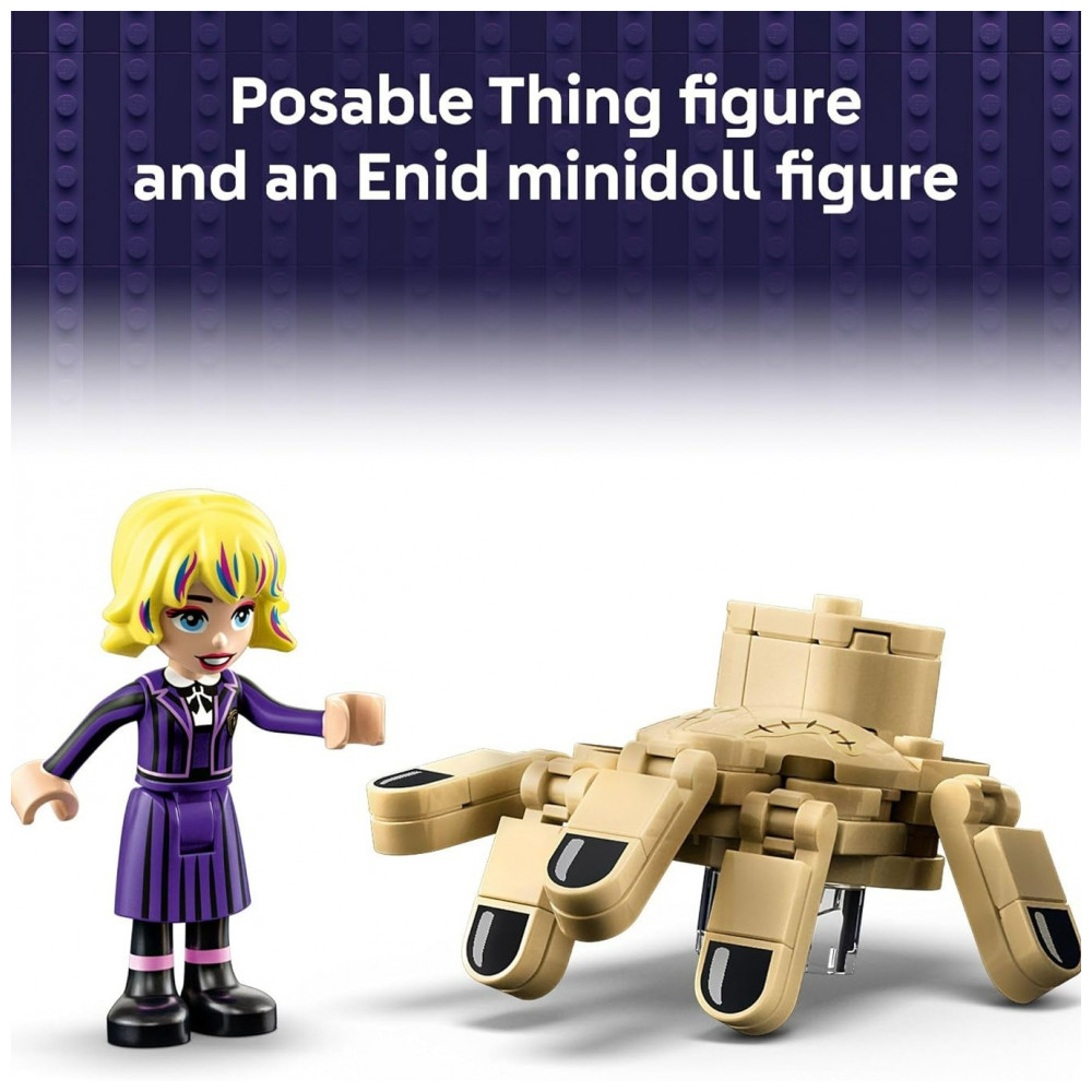 Com 828 peças, o set inclui uma maleta/baú que se abre para revelar o apartamento mobiliado de Thing — com cama, poltrona, chapéu, relógio, espaço para esmaltes e cremes, além de acessórios divertidos e inesperados. Junto vem uma minidoll de Enid Sinclair, e a figura articulada de Thing, pronta para situações de brincadeira ou exibição.