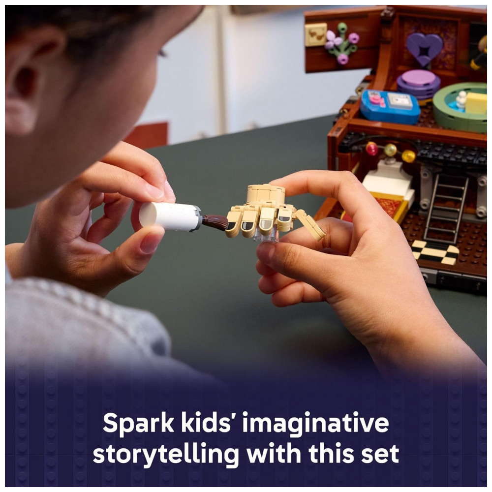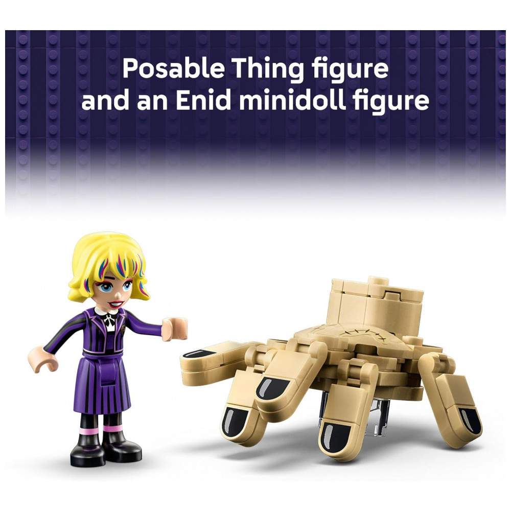 Composto por 828 peças, o kit apresenta um baú de dois andares que se abre para revelar o interior do apartamento do Thing. O espaço inclui uma cama, cadeira, chapéu, relógio e compartimentos para armazenar itens como adesivos, creme e outros acessórios pessoais do Thing. Além disso, o set acompanha uma figura posável do Thing e uma minifigura da Enid Sinclair, colega de quarto de Wednesday, permitindo recriar cenas icônicas da série.