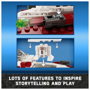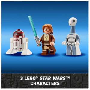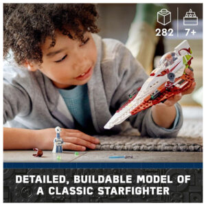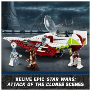 Brick built model of Obi Wan Kenobis Jedi Starfighter 75333 Fans can relive epic Star Wars Attack of the Clones scenes as they build and play with this LEGO Star Wars starfighter 2 LEGO minifigures Obi Wan Kenobi with a lightsaber and, for the first time, Taun We, plus an R4 P17 LEGO astromech droid figure Built to inspire play The starfighter has an opening minifigure cockpit, 2 stud shooters, retractable landing gear, lightsaber storage clips and an attachment point on the wing for R4 P17s head Gift idea for fans aged 7 and up Give this 282 piece building toy as a birthday present or holiday gift to Star Wars Attack of the Clones fans and LEGO Star Wars collectors For play and display The brick built Star Wars starfighter measures over 2.5 in. high, 10 in. long and 5 in. wide and can be displayed between playtime adventures