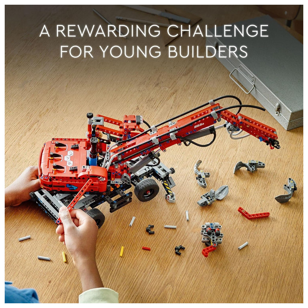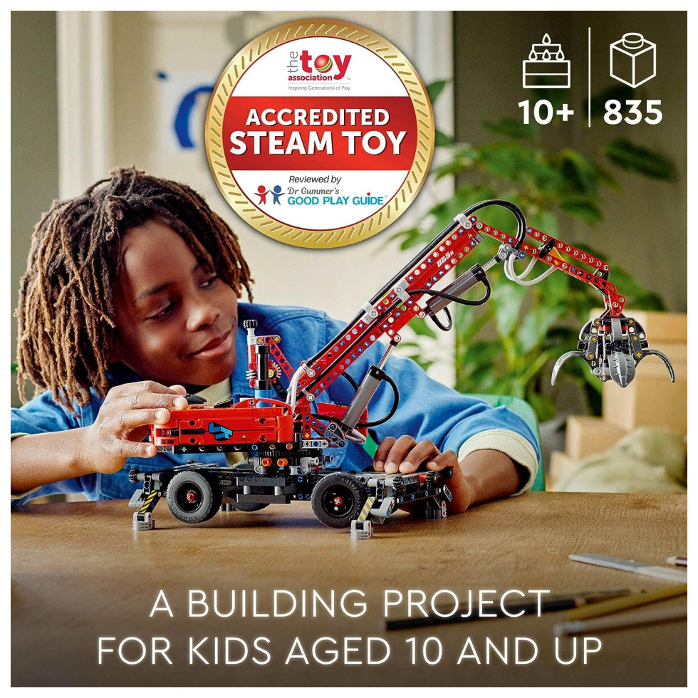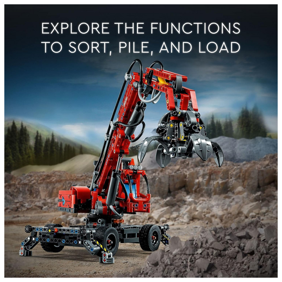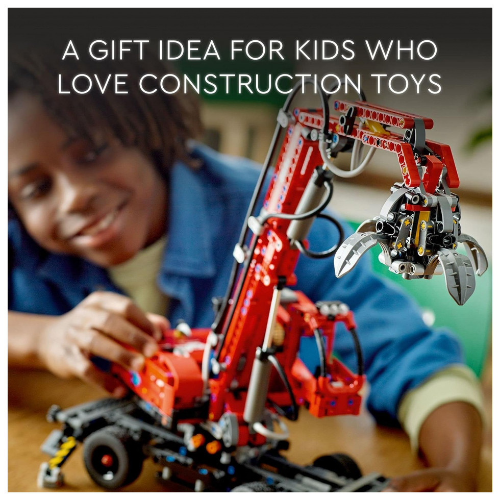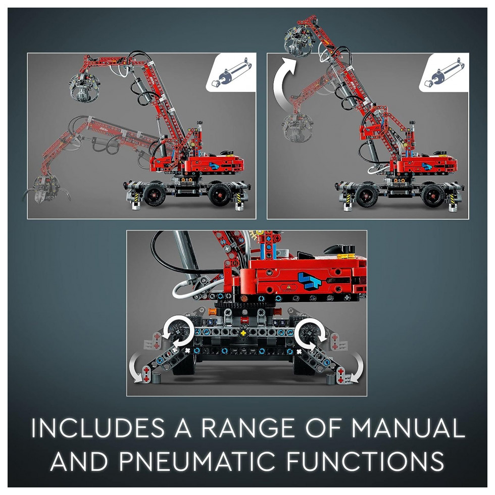 Know a kid who loves mechanics and engineering Theyll love this LEGO Technic Material Handler 42144 for ages 10. Designed for kids who love construction site toys, this mechanical model gives a fascinating look at how a material handler vehicle really works. It has lots of manual and pneumatic functions, so Pneumatic functions include a movable arm with an impressive reach of approximately 13 inches , plus a classic orange peel style grapple that opens and closes. Manual functions include an upper arm that can rotate through 360 degrees, an elevating operating cab, plus a mobile undercarriage system with steering and 4 outriggers. they can explore how this mighty toy material handler sorts, piles, and loads materials for processing. LEGO Technic buildable model sets feature realistic movement and mechanisms that introduce young LEGO builders to the universe of engineering in an approachable and realistic way.Discover how a material handler works Kids aged 10 will love exploring all the manual and pneumatic functions of this LEGO Technic Material Handler 42144 toy model set