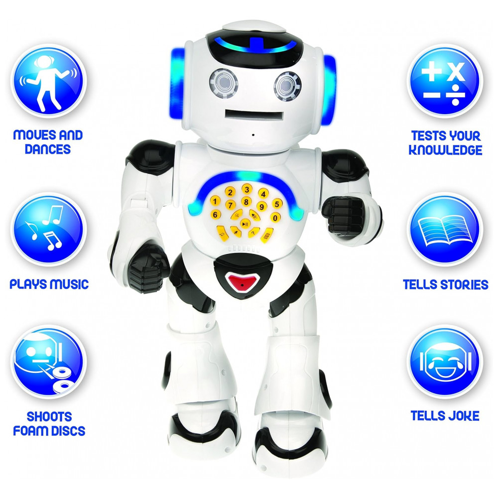 O LEXiBOOK Powerman é um robô interativo inteligente projetado para crianças a partir dos 4 anos. Este amigável robô dança, toca música, realiza quiz educacionais, conta histórias e até dispara discos de espuma! Com o botão de gravação, o Power Man repetirá o que você disser com sua voz engraçada de robô. Você pode controlar o Power Man para frente, para trás, para a direita e para a esquerda, ele se move em todas as direções. Além disso, ele possui efeitos de luz e som, tornando a interação ainda mais envolvente. Responda seus enigmas engraçados sobre números, animais e vida cotidiana. O Power Man conta histórias, desde as fabulas de Esopo até suas piadas favoritas. Divirta-se disparando discos de espuma e controlando o robô com o controle remoto. O pacote inclui 1 robô, 1 controle remoto, 1 manual de instruções e 9 discos de espuma.