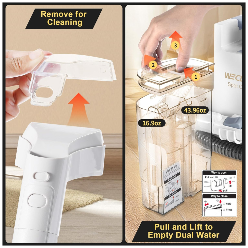 Tanques de Água Duplos: O limpador de tapetes WECLEAN C1 possui dois tanques de água para separar a água limpa da suja. Tanque de água limpa de 1,3 litros e tanque de água suja de 500 ml.