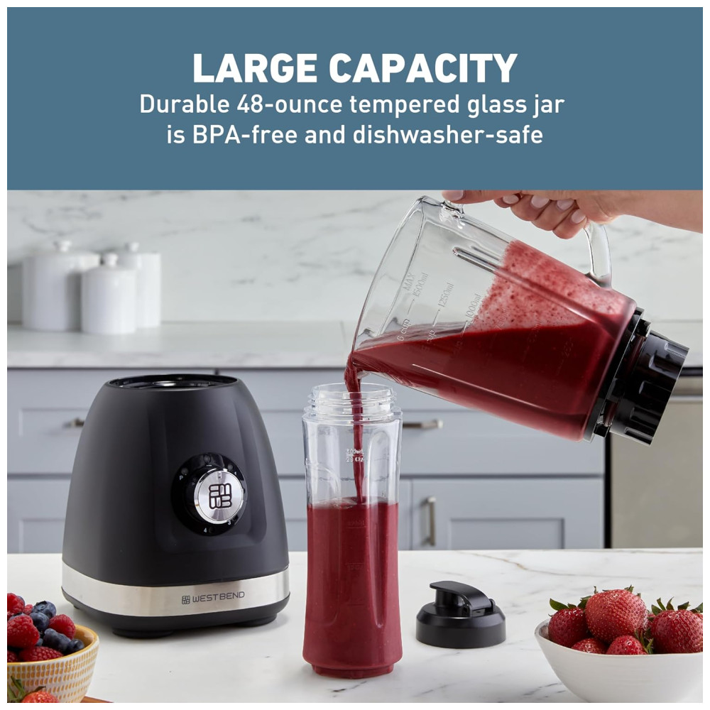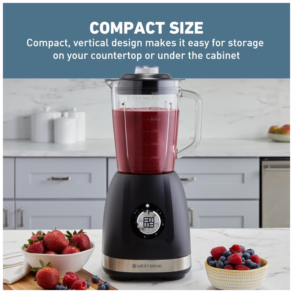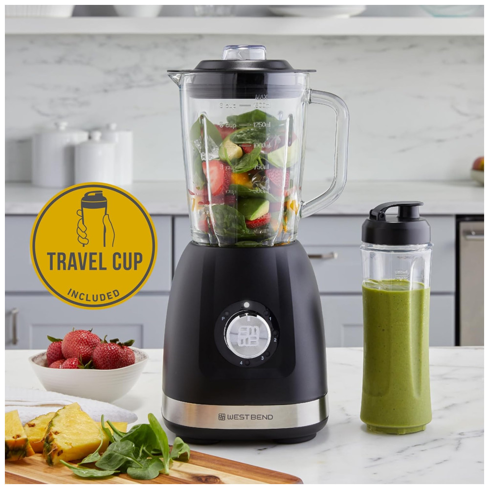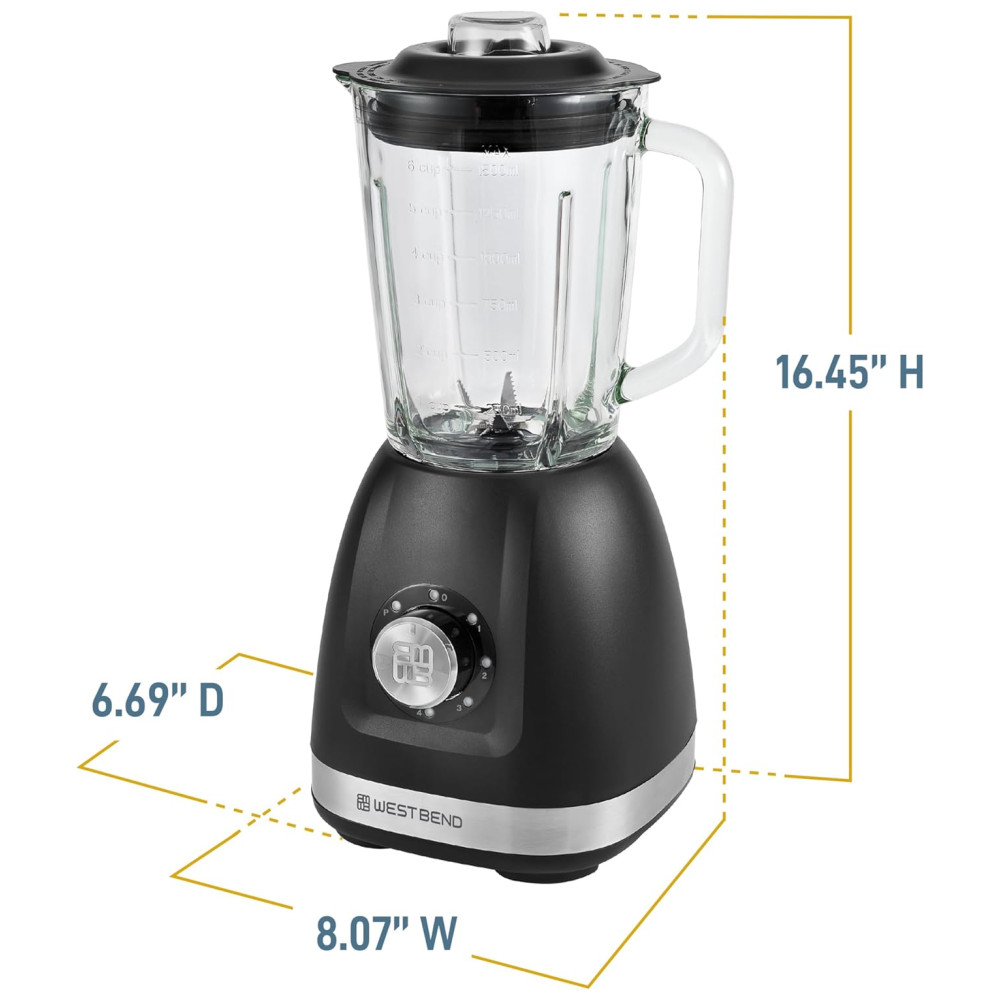 Descubra o Liquidificador West Bend com Jarra de Vidro Temperado de 1.42 Litros e Copo de Viagem de 591 ml, Design Compacto com Controle de Disco, 700 Watts, Preto.