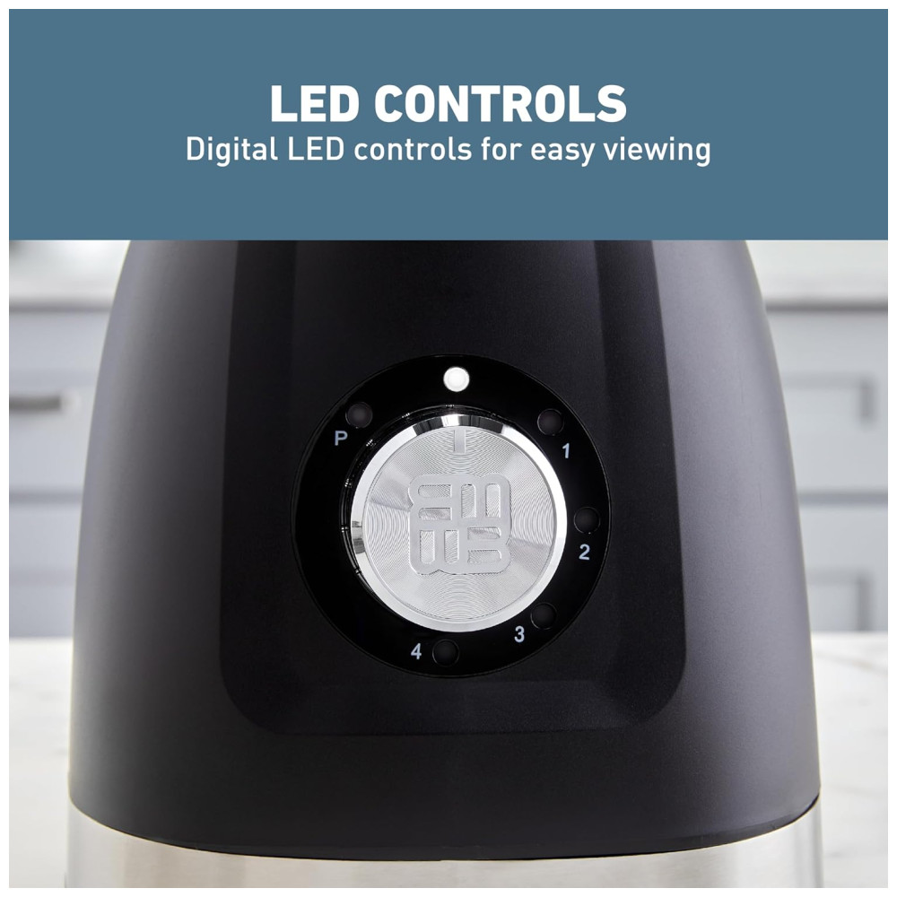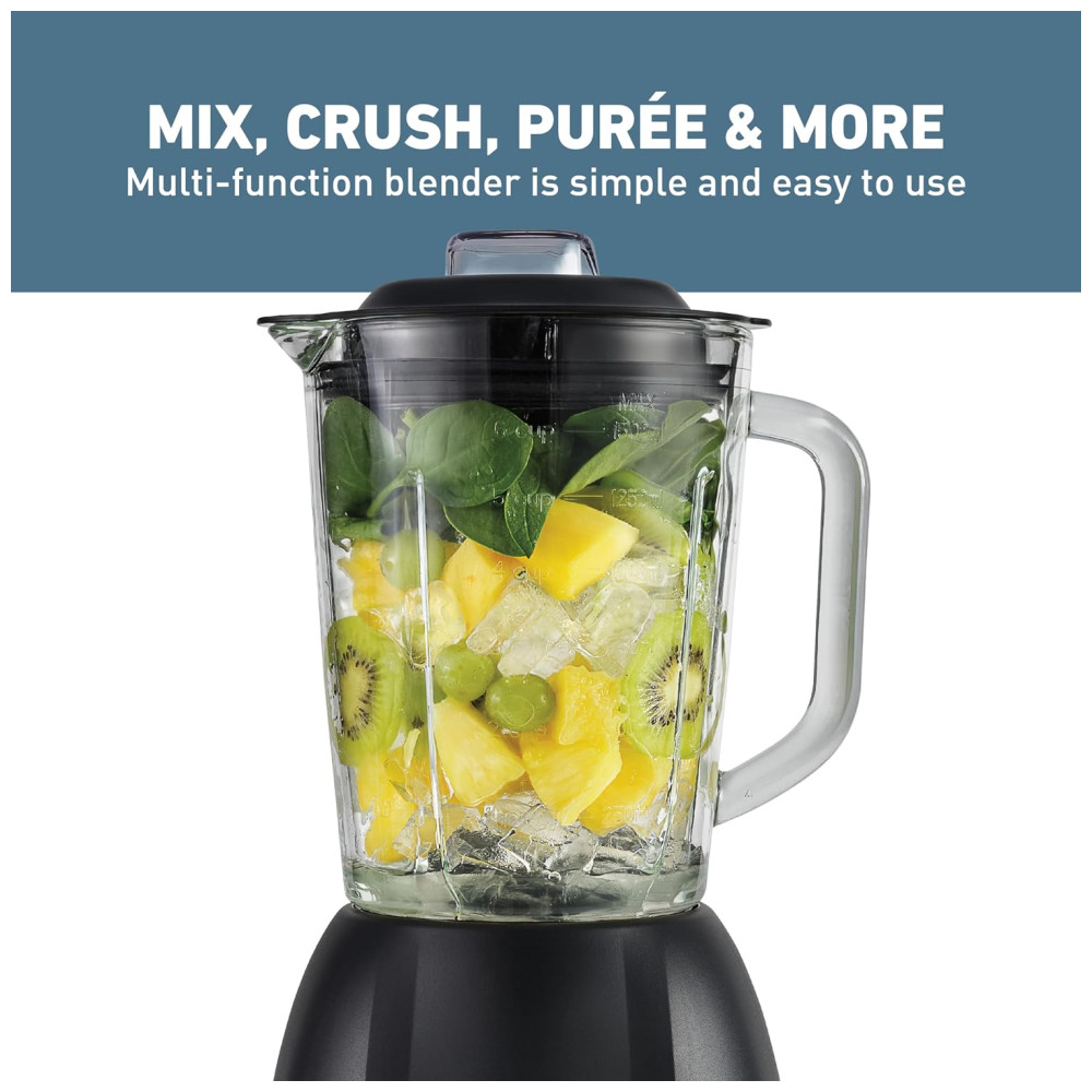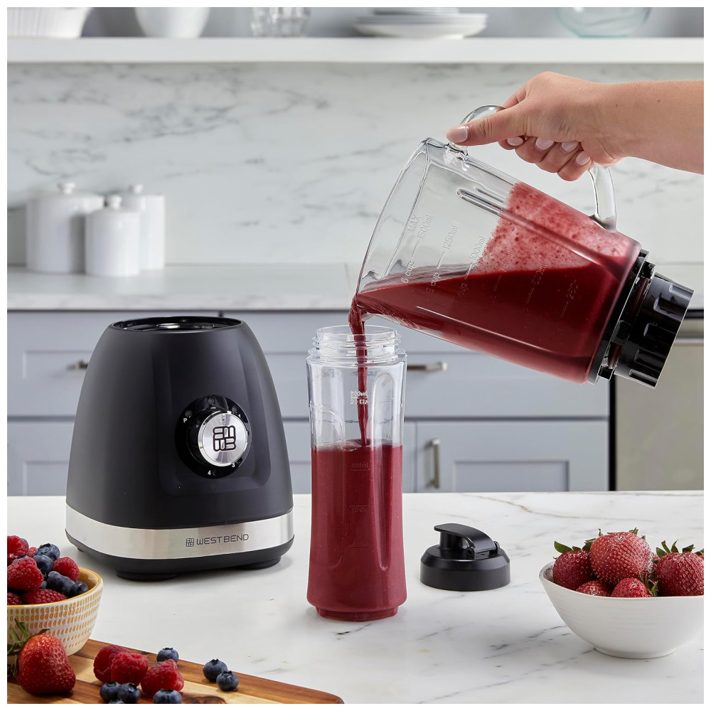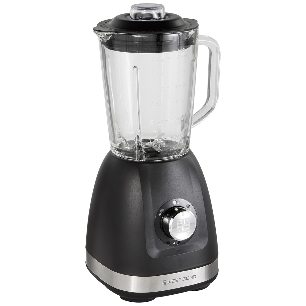 Descubra o Liquidificador West Bend com Jarra de Vidro Temperado de 1.42 Litros e Copo de Viagem de 591 ml, Design Compacto com Controle de Disco, 700 Watts, Preto.