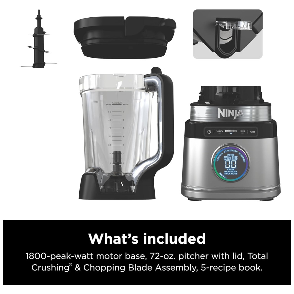Componentes Incluídos: Base do Motor de 1800W, Conjunto de Lâminas Ninja Detect Total Crushing & Chopping (Montagem de Lâmina Empilhada), Tampa da Jarra com Bico para Despejar, Jarra de 2,1 litros, Guia de Inspiração com 5 Receitas