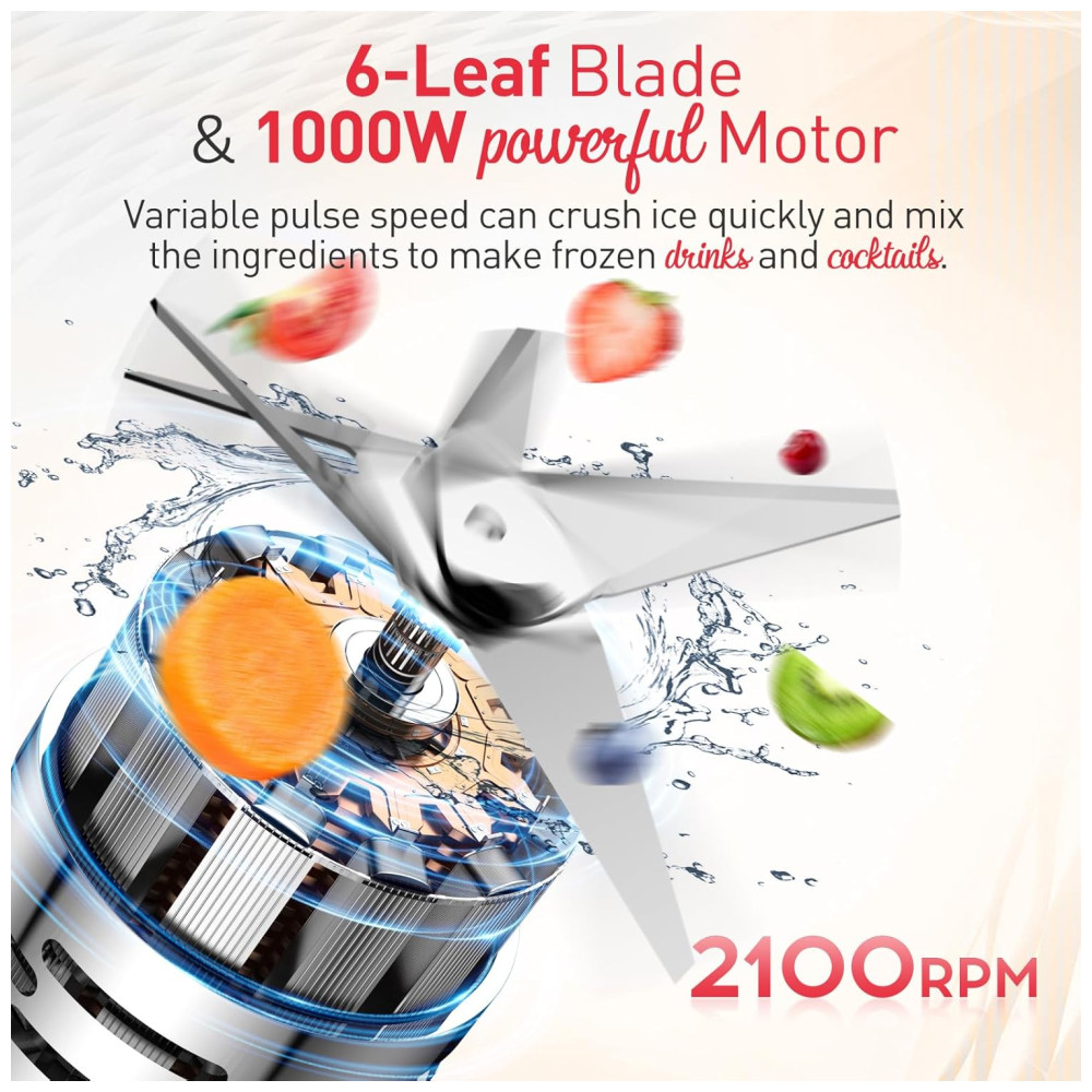 O motor de 1000W do nosso liquidificador para smoothies atinge uma velocidade de 21.000 rpm, permitindo lidar facilmente até mesmo com os ingredientes mais difíceis. Suas 6 lâminas afiadas de aço inoxidável trituram sem esforço gelo, vegetais, frutas e nozes, garantindo bebidas e refeições perfeitamente misturadas sempre.