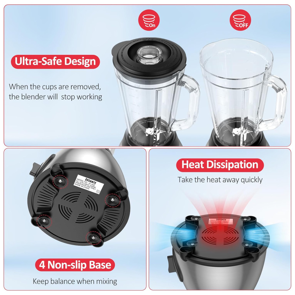 Nossos copos de mistura podem ser fixados com segurança na base graças ao sistema de bloqueio de segurança, garantindo que os copos não se soltem durante o uso. Além disso, nosso liquidificador de cozinha é projetado com proteção contra superaquecimento e sobrecarga para segurança adicional.